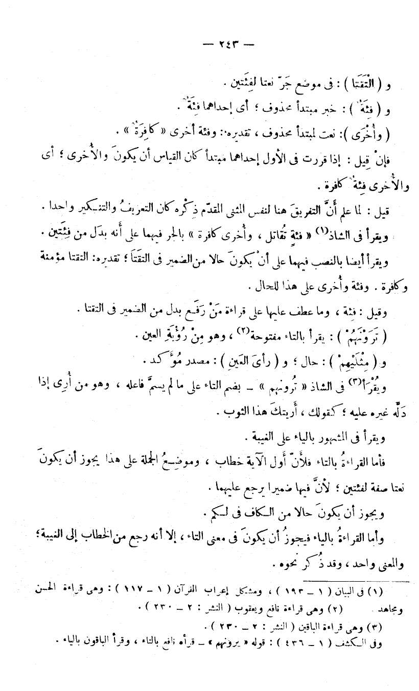 فَأَمَّا الْقِرَاءَةُ بِالتَّاءِ فَلِأَنَّ أَوَّلَ الْآيَةِ خِطَابٌ، وَمَوْضِعُ الْجُمْلَةِ عَلَى هَذَا يَجُوزُ أَنْ يَكُونَ نَعْتًا صِفَةً لِفِئَتَيْنِ ; لِأَنَّ فِيهَا ضَمِيرًا يَرْجِعُ عَلَيْهِمَا. وَيَجُوزُ أَنْ يَكُونَ حَالًا مِنَ الْكَافِ فِي لَكُمْ.