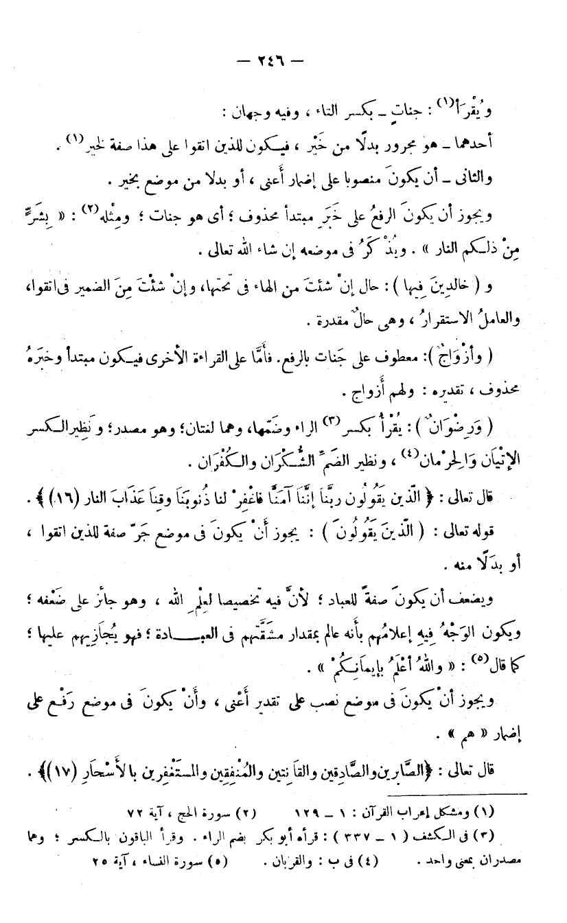 وَيُقْرَأُ جَنَّاتٌ بِكَسْرِ التَّاءِ وَفِيهِ وَجْهَانِ: أَحَدُهُمَا: هُوَ مَجْرُورٌ بَدَلًا مِنْ خَيْرٍ، فَيَكُونُ لِلَّذِينِ اتَّقَوْا عَلَى هَذَا صِفَةٌ لِخَيْرٍ.