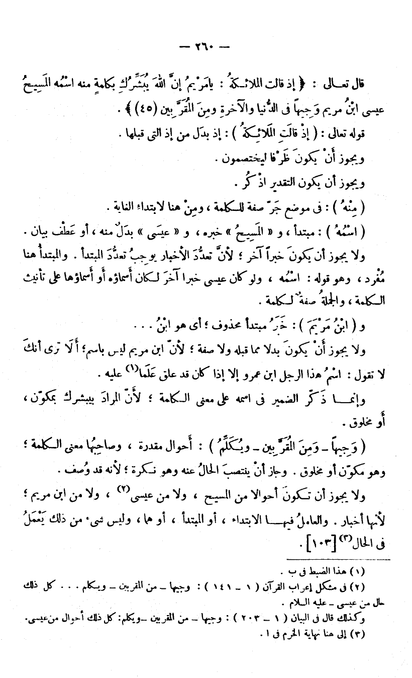 وَإِنَّمَا ذَكَرَ الضَّمِيرَ فِي اسْمِهِ عَلَى مَعْنَى الْكَلِمَةِ ; لِأَنَّ الْمُرَادَ بِيُبَشِّرُكِ بِمُكَوَّنٍ أَوْ مَخْلُوقٍ. (وَجِيهًا - وَمِنَ الْمُقَرَّبِينَ - وَيُكَلِّمُ) : أَحْوَالٌ مُقَدَّرَةٌ، وَصَاحِبُهَا مَعْنَى الْكَلِمَةِ، وَهُوَ مُكَوَّنٌ أَوْ مَخْلُوقٌ. وَجَازَ أَنْ يَنْتَصِبَ الْحَالُ عَنْهُ وَهُوَ نَكِرَةٌ ; لِأَنَّهُ قَدْ وُصِفَ.