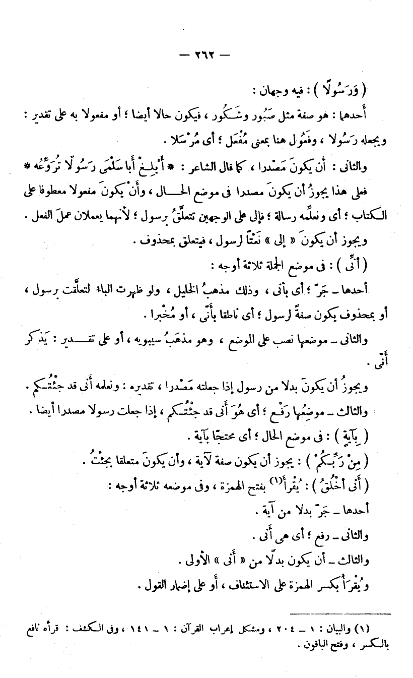 فَعَلَى هَذَا يَجُوزُ أَنْ يَكُونَ مَصْدَرًا فِي مَوْضِعِ الْحَالِ، وَأَنْ يَكُونَ مَفْعُولًا مَعْطُوفًا عَلَى الْكِتَابِ ; أَيْ نُعَلِّمُهُ رِسَالَةً ; فَإِلَى عَلَى الْوَجْهَيْنِ تَتَعَلَّقُ بِرَسُولٍ ; لِأَنَّهُمَا يَعْمَلَانِ عَمَلَ الْفِعْلِ. وَيَجُوزُ أَنْ يَكُونَ «إِلَى» نَعْتًا لِرَسُولٍ فَيَتَعَلَّقُ بِمَحْذُوفٍ.