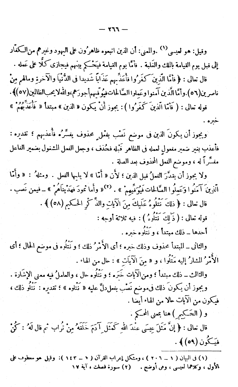 وَالثَّالِثُ: ذَلِكَ مُبْتَدَأٌ ; وَمِنَ الْآيَاتِ خَبَرُهُ ; وَنَتْلُوهُ حَالٌ، وَالْعَامِلُ فِيهِ مَعْنَى الْإِشَارَةِ، وَيَجُوزُ أَنْ يَكُونَ ذَلِكَ فِي مَوْضِعِ نَصْبٍ بِفِعْلٍ دَلَّ عَلَيْهِ «نَتْلُوهُ» تَقْدِيرُهُ: نَتْلُو ذَلِكَ فَيَكُونُ مِنَ الْآيَاتِ حَالًا مِنَ الْهَاءِ أَيْضًا. وَ (الْحَكِيمِ) : هُنَا بِمَعْنَى الْمُحْكَمِ.
