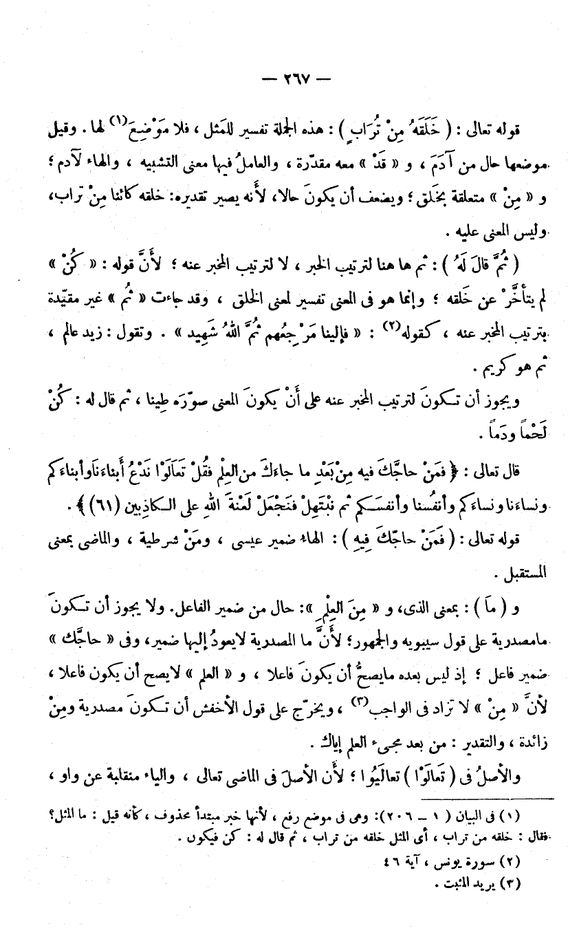 قَوْلُهُ تَعَالَى: (خَلَقَهُ مِنْ تُرَابٍ) : هَذِهِ الْجُمْلَةُ تَفْسِيرٌ لِلْمَثَلِ فَلَا مَوْضِعَ لَهَا، وَقِيلَ: مَوْضِعُهَا حَالٌ مِنْ آدَمَ، وَ «قَدْ» مَعَهُ مُقَدَّرَةٌ وَالْعَامِلُ فِيهَا مَعْنَى التَّشْبِيهِ، وَالْهَاءُ لِآدَمَ، وَمِنْ مُتَعَلِّقَةٌ بِخَلْقٍ، وَيَضْعُفُ أَنْ يَكُونَ حَالًا ; لِأَنَّهُ يَصِيرُ تَقْدِيرُهُ: خَلَقَهُ كَائِنًا مِنْ تُرَابٍ، وَلَيْسَ الْمَعْنَى عَلَيْهِ. (ثُمَّ قَالَ لَهُ) : ثُمَّ هَاهُنَا لِتَرْتِيبِ الْخَبَرِ، لَا لِتَرْتِيبِ الْمُخْبَرِ عَنْهُ ; لِأَنَّ قَوْلَهُ: «كُنْ» لَمْ يَتَأَخَّرْ عَنْ خَلْقِهِ، وَإِنَّمَا هُوَ فِي الْمَعْنَى تَفْسِيرٌ لِمَعْنَى الْخَلْقِ، وَقَدْ جَاءَتْ ثُمَّ غَيْرُ مُقَيَّدَةٍ بِتَرْتِيبِ الْمُخْبَرِ عَنْهُ ; كَقَوْلِهِ: (فَإِلَيْنَا مَرْجِعُهُمْ ثُمَّ اللَّهُ شَهِيدٌ) [يُونُسَ: 46] وَتَقُولُ: زَيْدٌ عَالِمٌ، ثُمَّ هُوَ كَرِيمٌ، وَيَجُوزُ أَنْ يَكُونَ لِتَرْتِيبِ الْمُخْبَرِ عَنْهُ عَلَى أَنْ يَكُونَ الْمَعْنَى صَوَّرَهُ طِينًا، ثُمَّ قَالَ لَهُ: كُنْ لَحْمًا وَدَمًا.