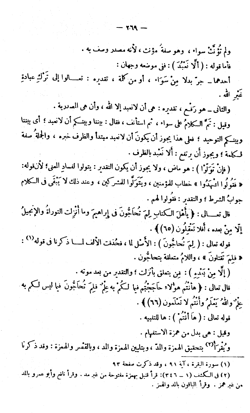 وَلَمْ تُؤَنَّثْ سَوَاءٍ، وَهُوَ صِفَةُ مُؤَنَّثٍ ; لِأَنَّهُ مَصْدَرٌ وُصِفَ بِهِ، فَأَمَّا قَوْلُهُ: (أَلَّا نَعْبُدَ) : فَفِي مَوْضِعِهِ وَجْهَانِ: أَحَدُهُمَا: جَرٌّ بَدَلًا مِنْ سَوَاءٍ، أَوْ مِنْ كَلِمَةٍ تَقْدِيرُهُ: تَعَالَوْا إِلَى تَرْكِ عِبَادَةِ غَيْرِ اللَّهِ. وَالثَّانِي: هُوَ رَفْعٌ، تَقْدِيرُهُ: هِيَ أَنْ لَا نَعْبُدَ إِلَّا اللَّهَ، وَأَنْ هِيَ الْمَصْدَرِيَّةُ، وَقِيلَ: تَمَّ الْكَلَامُ عَلَى سَوَاءٍ، ثُمَّ اسْتَأْنَفَ فَقَالَ: بَيْنَنَا وَبَيْنَكُمْ أَنْ لَا نَعْبُدَ ; أَيْ بَيْنَنَا وَبَيْنَكُمُ التَّوْحِيدُ، فَعَلَى هَذَا يَجُوزُ أَنْ يَكُونَ (أَلَّا نَعْبُدَ) مُبْتَدَأً، وَالظَّرْفُ خَبَرَهُ، وَالْجُمْلَةُ صِفَةٌ لِكَلِمَةٍ، وَيَجُوزُ أَنْ يَرْتَفِعَ أَلَّا نَعْبُدَ بِالظَّرْفِ. (فَإِنْ تَوَلَّوْا) : هُوَ مَاضٍ، وَلَا يَجُوزُ أَنْ يَكُونَ التَّقْدِيرُ: يَتَوَلَّوْا لِفَسَادِ الْمَعْنَى ; لِأَنَّ قَوْلَهُ: فَقُولُوا اشْهَدُوا خِطَابٌ لِلْمُؤْمِنِينَ، وَيَتَوَلَّوْا لِلْمُشْرِكِينَ، وَعِنْدَ ذَلِكَ لَا يَبْقَى فِي الْكَلَامِ جَوَابُ الشَّرْطِ ; وَالتَّقْدِيرُ: فَقُولُوا لَهُمْ.