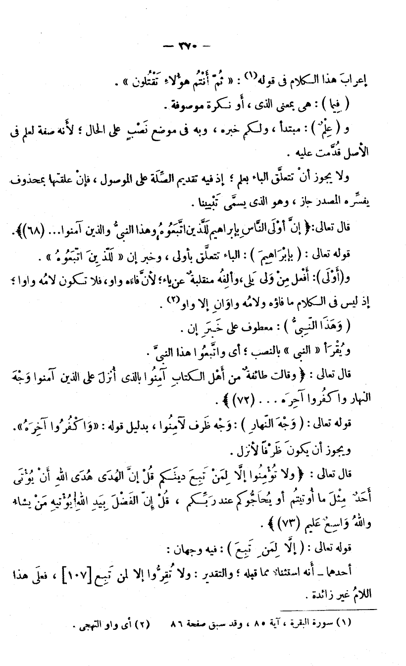 إِعْرَابَ هَذَا الْكَلَامِ فِي قَوْلِهِ: (ثُمَّ أَنْتُمْ هَؤُلَاءِ تَقْتُلُونَ) [الْبَقَرَةِ: 85] (فِيمَا) : هِيَ بِمَعْنَى الَّذِي، أَوْ نَكِرَةٌ مَوْصُوفَةٌ. وَ (عِلْمٌ) : مُبْتَدَأٌ، وَلَكُمْ خَبَرُهُ، وَبِهِ فِي مَوْضِعِ نَصْبٍ عَلَى الْحَالِ ; لِأَنَّهُ صِفَةٌ لِعِلْمٍ فِي الْأَصْلِ قُدِّمَتْ عَلَيْهِ، وَلَا يَجُوزُ أَنْ تَتَعَلَّقَ الْبَاءُ بِعِلْمٍ ; إِذْ فِيهِ تَقْدِيمُ الصِّلَةِ عَلَى الْمَوْصُولِ، فَإِنْ عَلَّقْتَهَا بِمَحْذُوفٍ يُفَسِّرُهُ الْمَصْدَرُ جَازَ، وَهُوَ الَّذِي يُسَمَّى تَبْيِينًا.