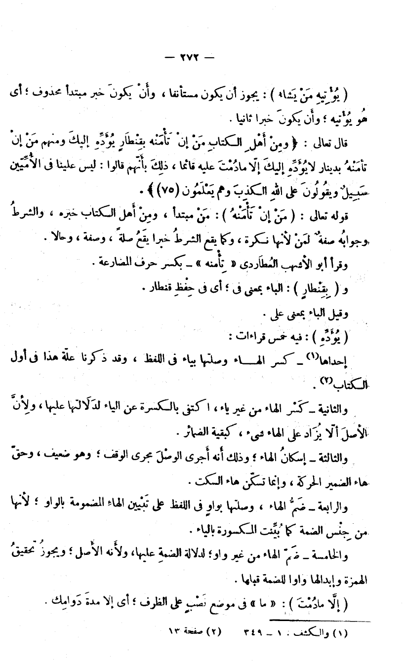 قَوْلُهُ تَعَالَى: (مَنْ إِنْ تَأْمَنْهُ) : مَنْ مُبْتَدَأٌ، وَمِنْ أَهْلِ الْكِتَابِ خَبَرُهُ، وَالشَّرْطُ وَجَوَابُهُ صِفَةٌ لِمَنْ ; لِأَنَّهَا نَكِرَةٌ، وَكَمَا يَقَعُ الشَّرْطُ خَبَرًا يَقَعُ صِلَةً وَصِفَةً وَحَالًا. وَقَرَأَ أَبُو الْأَشْهَبِ الْعُطَارِدِيُّ: «تِأْمَنْهُ» بِكَسْرِ حَرْفِ الْمُضَارَعَةِ. وَ (بِقِنْطَارٍ) : الْبَاءُ بِمَعْنَى فِي ; أَيْ فِي حِفْظِ قِنْطَارٍ، وَقِيلَ: الْبَاءُ بِمَعْنَى عَلَى. (يُؤَدِّهِ) : فِيهِ خَمْسُ قِرَاءَاتٍ، إِحْدَاهَا كَسْرُ الْهَاءِ وَصِلَتُهَا بِيَاءٍ فِي اللَّفْظِ، وَقَدْ ذَكَرْنَا عِلَّةَ هَذَا فِي أَوَّلِ الْكِتَابِ. وَالثَّانِيَةُ كَسْرُ الْهَاءِ مِنْ غَيْرِ يَاءٍ اكْتَفَى بِالْكَسْرَةِ عَنِ الْيَاءِ لِدَلَالَتِهَا عَلَيْهَا، وَلِأَنَّ الْأَصْلَ أَنْ لَا يُزَادَ عَلَى الْهَاءِ شَيْءٌ كَبَقِيَّةِ الضَّمَائِرِ. وَالثَّالِثَةُ: إِسْكَانُ الْهَاءِ، وَذَلِكَ أَنَّهُ أُجْرِيَ الْوَصْلُ مُجْرَى الْوَقْفِ وَهُوَ ضَعِيفٌ وَحَقُّ هَاءِ الضَّمِيرِ الْحَرَكَةُ، وَإِنَّمَا تَسَكَّنُ هَاءُ السَّكْتِ. وَالرَّابِعَةُ ضَمُّ الْهَاءِ، وَصِلَتُهَا بِوَاوٍ فِي اللَّفْظِ عَلَى تَبْيِينِ