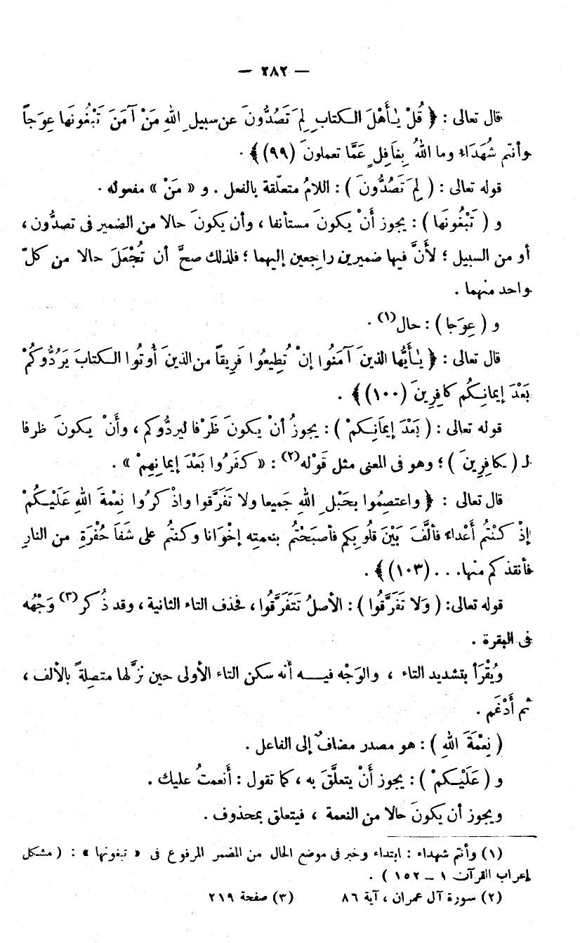 قَوْلُهُ تَعَالَى: (لِمَ تَصُدُّونَ) : اللَّامُ مُتَعَلِّقَةٌ بِالْفِعْلِ وَ «مِنْ» مَفْعُولُهُ. وَ (تَبْغُونَهَا) : يَجُوزُ أَنْ يَكُونَ مُسْتَأْنَفًا، وَأَنْ يَكُونَ حَالًا مِنَ الضَّمِيرِ فِي تَصُدُّونَ، أَوْ مِنَ السَّبِيلِ ; لِأَنَّ فِيهَا ضَمِيرَيْنِ رَاجِعَيْنِ إِلَيْهِمَا ; فَلِذَلِكَ صَحَّ أَنْ تُجْعَلَ حَالًا مِنْ كُلِّ وَاحِدٍ مِنْهُمَا.