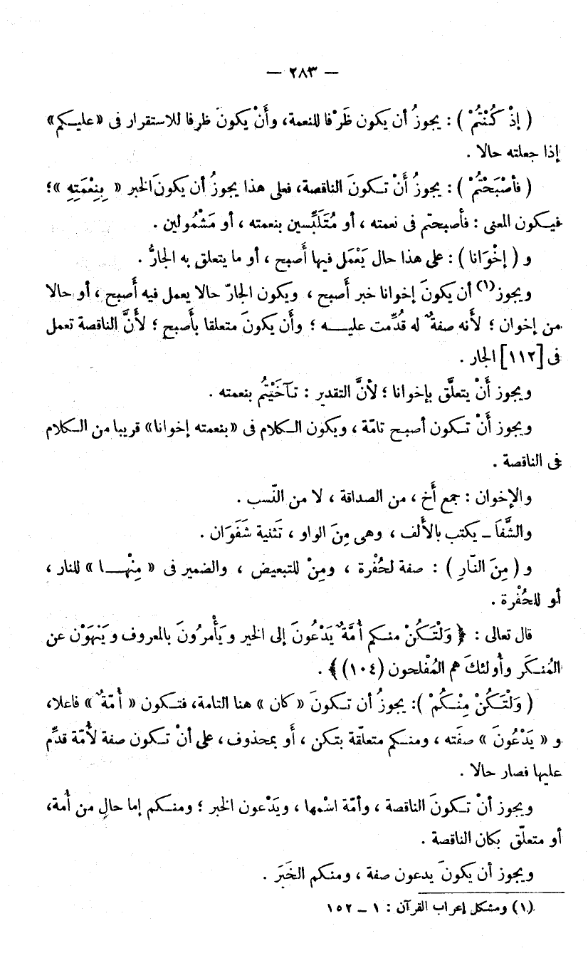 (وَلْتَكُنْ مِنْكُمْ) : يَجُوزُ أَنْ تَكُونَ " كَانَ " هُنَا التَّامَّةَ، فَتَكُونُ " أُمَّةٌ " فَاعِلًا، وَ " يَدْعُونَ " صِفَتُهُ، وَمِنْكُمْ مُتَعَلِّقَةٌ بِتَكُنْ، أَوْ بِمَحْذُوفٍ، عَلَى أَنْ تَكُونَ صِفَةً لِأُمَّةٍ قُدِّمَ عَلَيْهَا فَصَارَ حَالًا.