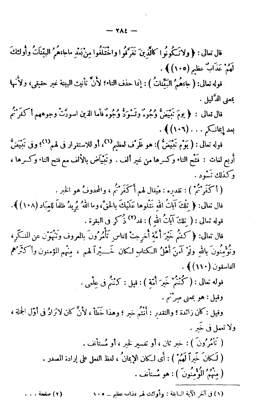 قَوْلُهُ تَعَالَى: (كُنْتُمْ خَيْرَ أُمَّةٍ) : قِيلَ: كُنْتُمْ فِي عِلْمِي. وَقِيلَ: هُوَ بِمَعْنَى صِرْتُمْ. وَقِيلَ: كَانَ زَائِدَةٌ ; وَالتَّقْدِيرُ: أَنْتُمْ خَيْرَ، وَهَذَا خَطَأٌ ; لِأَنَّ كَانَ لَا تُزَادُ فِي أَوَّلِ الْجُمْلَةِ، وَلَا تَعْمَلُ فِي خَيْرٍ. (تَأْمُرُونَ) : خَبَرٌ ثَانٍ، أَوْ تَفْسِيرٌ لِخَبَرٍ، أَوْ مُسْتَأْنَفٌ.