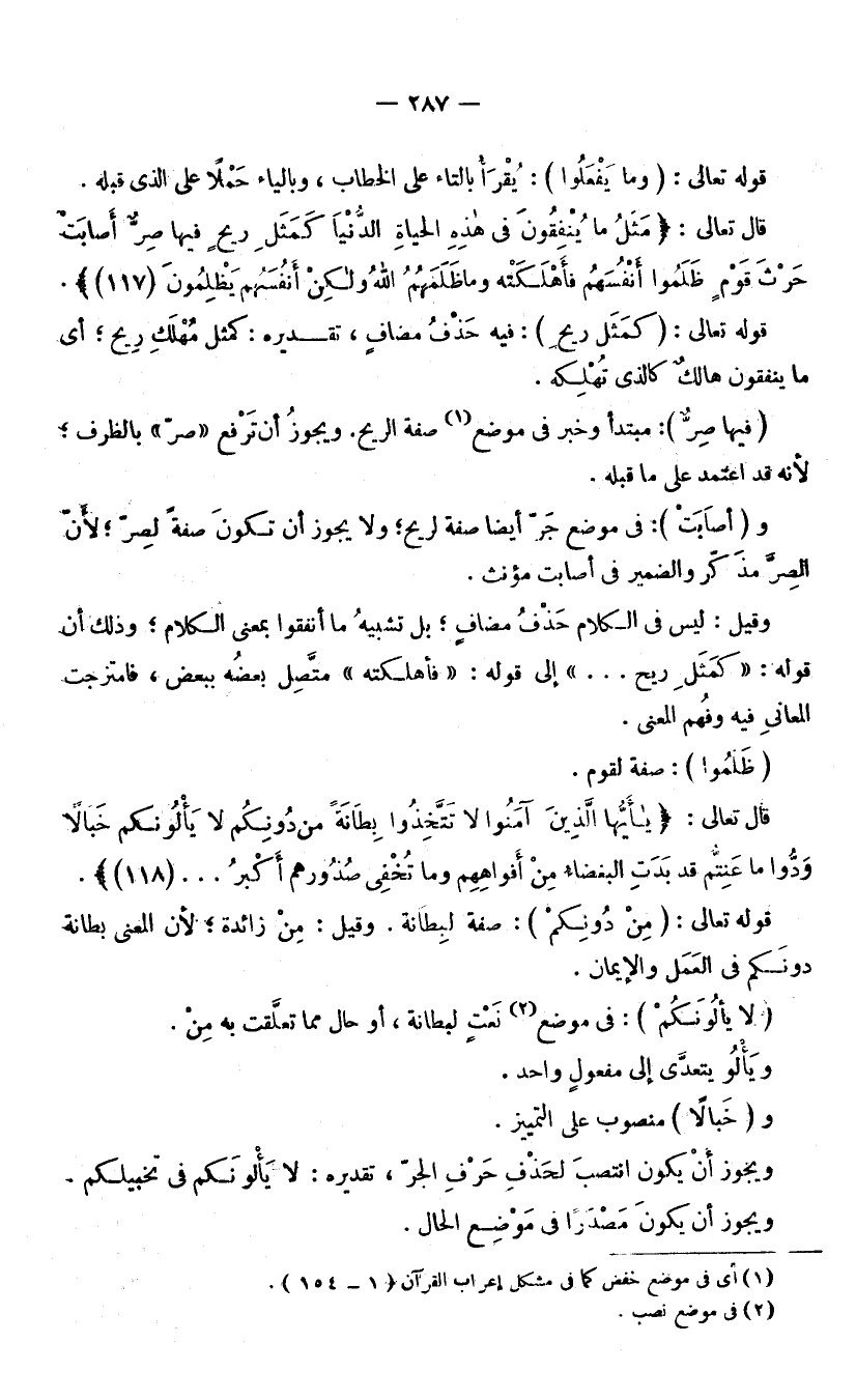 قَوْلُهُ تَعَالَى: (كَمَثَلِ رِيحٍ) : فِيهِ حَذْفُ مُضَافٍ تَقْدِيرُهُ: كَمَثَلِ مُهْلَكِ رِيحٍ ; أَيْ مَا يُنْفِقُونَ هَالِكٌ كَالَّذِي تُهْلِكُهُ. (فِيهَا صِرٌّ) : مُبْتَدَأٌ وَخَبَرٌ فِي مَوْضِعِ صِفَةِ الرِّيحِ. وَيَجُوزُ أَنْ تَرْفَعَ صِرًّا بِالظَّرْفِ ; لِأَنَّهُ قَدِ اعْتَمَدَ عَلَى مَا قَبْلَهُ. وَ (أَصَابَتْ) : فِي مَوْضِعِ جَرٍّ أَيْضًا صِفَةً لِرِيحٍ ; وَلَا يَجُوزُ أَنْ تَكُونَ صِفَةً لَـ (صِرٌّ) ; لِأَنَّ الصِّرَّ مُذَكَّرٌ، وَالضَّمِيرُ فِي أَصَابَتْ مُؤَنَّثٌ. وَقِيلَ: لَيْسَ فِي الْكَلَامِ حَذْفُ مُضَافٍ، بَلْ تَشْبِيهُ مَا أَنْفَقُوا بِمَعْنَى الْكَلَامِ، وَذَلِكَ أَنَّ قَوْلَهُ: (كَمَثَلِ رِيحٍ. . . .) إِلَى قَوْلِهِ: (فَأَهْلَكَتْهُ) مُتَّصِلٌ بَعْضُهُ بِبَعْضٍ، فَامْتَزَجَتِ الْمَعَانِي فِيهِ، وَفُهِمَ الْمَعْنَى. (ظَلَمُوا) : صِفَةٌ لِقَوْمٍ.