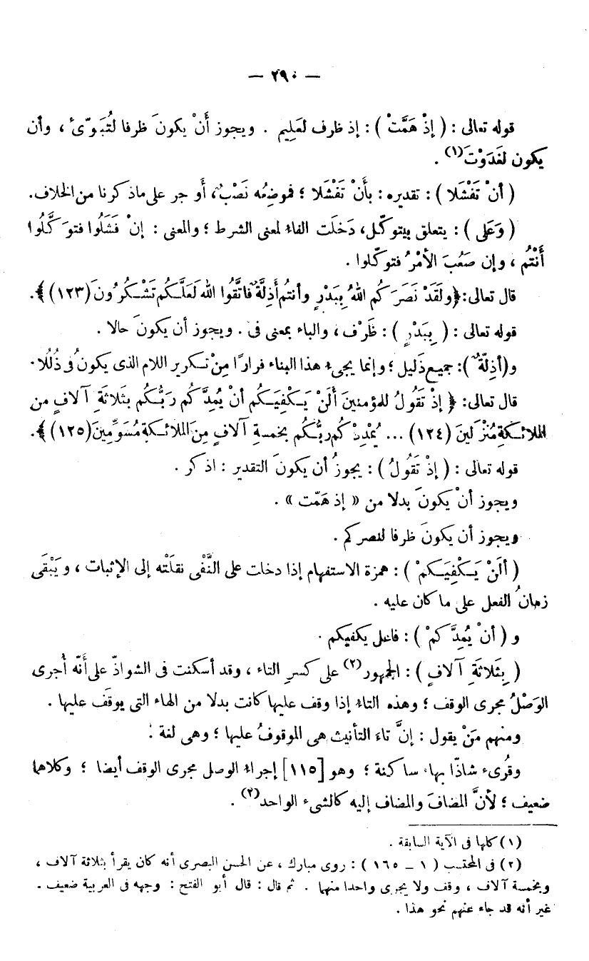 قَوْلُهُ تَعَالَى: (إِذْ) : تَقُولُ يَجُوزُ أَنْ يَكُونَ التَّقْدِيرُ: اذْكُرْ. وَيَجُوزُ أَنْ يَكُونَ بَدَلًا مِنْ «إِذْ هَمَّتْ» . وَيَجُوزُ أَنْ يَكُونَ ظَرْفًا لِنَصَرَكُمْ. (أَلَنْ يَكْفِيَكُمْ) : هَمْزَةُ الِاسْتِفْهَامِ إِذَا دَخَلَتْ عَلَى النَّفْيِ نَقَلَتْهُ إِلَّا الْإِثْبَاتِ، وَيَبْقَى زَمَانُ الْفِعْلِ عَلَى مَا كَانَ عَلَيْهِ. وَ (أَنْ يُمِدَّكُمْ) : فَاعِلُ يَكْفِيَكُمْ. (بِثَلَاثَةِ آلَافٍ) : الْجُمْهُورُ عَلَى كَسْرِ الْفَاءِ، وَقَدْ أُسْكِنَتْ فِي الشَّوَاذِّ عَلَى أَنَّهُ أَجْرَى الْوَصْلَ مُجْرَى الْوَقْفِ، وَهَذِهِ التَّاءُ إِذَا وُقِفَ عَلَيْهَا كَانَتْ بَدَلًا مِنَ الْهَاءِ الَّتِي يُوقَفُ عَلَيْهَا، وَمِنْهُمْ مَنْ يَقُولُ: إِنَّ تَاءَ التَّأْنِيثِ هِيَ الْمَوْقُوفُ عَلَيْهَا وَهِيَ لُغَةٌ. وَقُرِئَ شَاذًّا بِهَاءٍ سَاكِنَةٍ ; وَهُوَ إِجْرَاءُ الْوَصْلِ مُجْرَى الْوَقْفِ أَيْضًا، وَكِلَاهُمَا ضَعِيفٌ ; لِأَنَّ الْمُضَافَ وَالْمُضَافَ إِلَيْهِ كَالشَّيْءِ الْوَاحِدِ. (