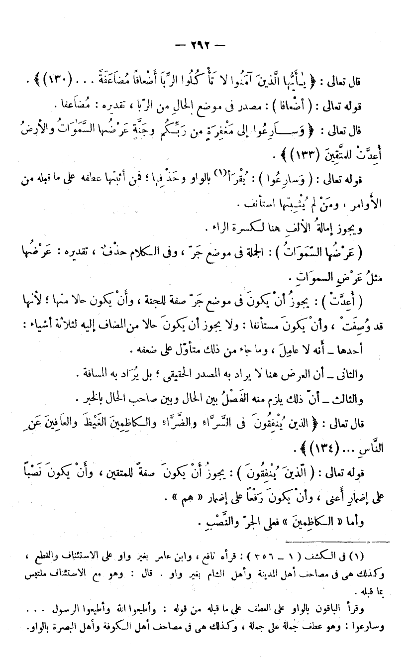 قَوْلُهُ تَعَالَى: (وَسَارِعُوا) : يُقْرَأُ بِالْوَاوِ وَحَذْفِهَا، فَمَنْ أَثْبَتَهَا عَطَفَهُ عَلَى مَا قَبْلَهُ مِنَ الْأَوَامِرِ، وَمَنْ لَمْ يُثْبِتْهَا اسْتَأْنَفَ. وَيَجُوزُ إِمَالَةُ الْأَلِفِ هُنَا لِكَسْرَةِ الرَّاءِ.