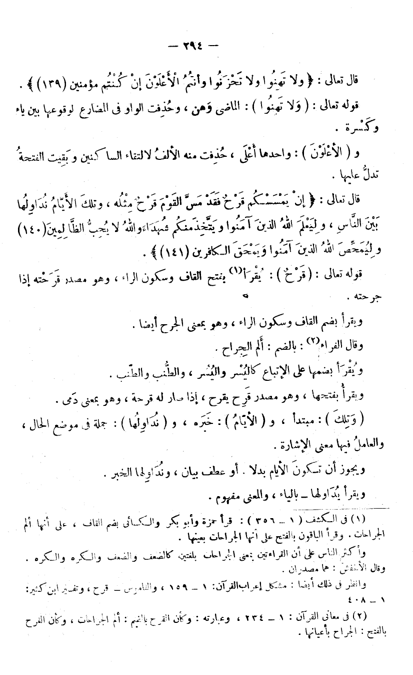 قَوْلُهُ تَعَالَى: (قَرْحٌ) : يُقْرَأُ بِفَتْحِ الْقَافِ وَسُكُونِ الرَّاءِ، وَهُوَ مَصْدَرُ قَرَحْتُهُ إِذَا جَرَحْتُهُ، وَيُقْرَأُ بِضَمِّ الْقَافِ وَسُكُونِ الرَّاءِ، وَهُوَ بِمَعْنَى الْجُرْحِ أَيْضًا، وَقَالَ الْفَرَّاءُ: بِالضَّمِّ: أَلَمُ الْجِرَاحِ. وَيُقْرَأُ بِضَمِّهِمَا عَلَى الْإِتْبَاعِ كَالْيُسْرِ وَالْيُسُرِ، وَالطُّنْبِ وَالطُّنُبِ، وَيُقْرَأُ بِفَتْحِهَا، وَهُوَ مَصْدَرُ قَرُحَ يَقْرَحُ إِذَا صَارَ لَهُ قُرْحَةً، وَهُوَ بِمَعْنَى دَمِيَ. (وَتِلْكَ) : مُبْتَدَأٌ، وَ (الْأَيَّامُ) : خَبَرُهُ، وَ (نُدَاوِلُهَا) : جُمْلَةٌ فِي مَوْضِعِ الْحَالِ، وَالْعَامِلُ فِيهَا مَعْنَى الْإِشَارَةِ، وَيَجُوزُ أَنْ تَكُونَ الْأَيَّامُ بَدَلًا، أَوْ عَطْفَ بَيَانٍ، وَنُدَاوِلُهَا الْخَبَرُ، وَيُقْرَأُ يُدَاوِلُهَا بِالْيَاءِ، وَالْمَعْنَى مَفْهُومٌ.