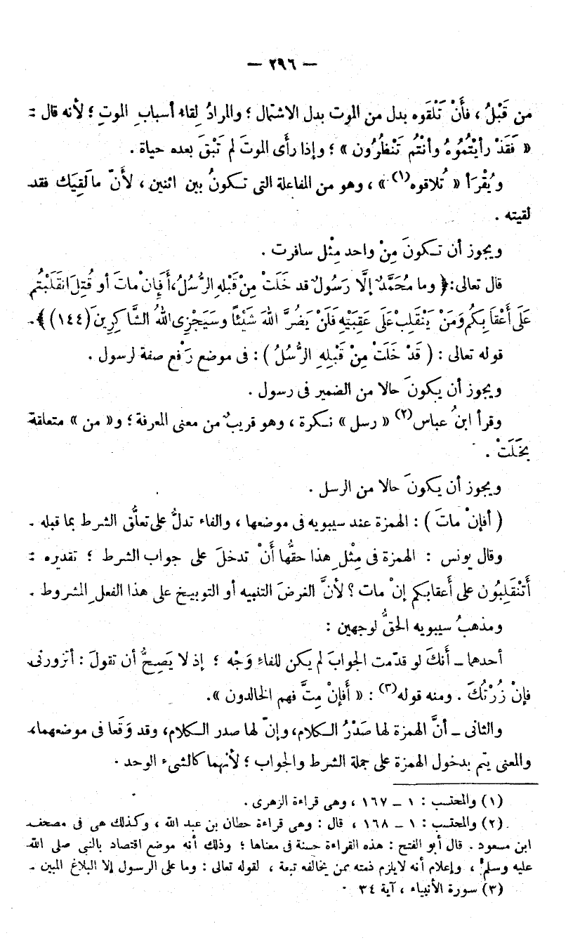 وَيَجُوزُ أَنْ يَكُونَ حَالًا مِنَ الضَّمِيرِ فِي رَسُولٍ، وَقَرَأَ ابْنُ عَبَّاسٍ: «رُسُلٌ» نَكِرَةٌ، وَهُوَ قَرِيبٌ مِنْ مَعْنَى الْمَعْرِفَةِ، وَمِنْ مُتَعَلِّقَةٌ بِخَلَتْ، وَيَجُوزُ أَنْ يَكُونَ حَالًا مِنَ الرُّسُلِ. أَفَإِنْ مَاتَ الْهَمْزَةُ عِنْدَ سِيبَوَيْهِ فِي مَوْضِعِهَا، وَالْفَاءُ تَدُلُّ عَلَى تَعَلُّقِ الشَّرْطِ بِمَا قَبْلَهُ، وَقَالَ يُونُسُ: الْهَمْزَةُ فِي مِثْلِ هَذَا حَقُّهَا أَنْ تَدْخُلَ عَلَى جَوَابِ الشَّرْطِ تَقْدِيرُهُ: أَتَنْقَلِبُونَ عَلَى أَعْقَابِكُمْ إِنْ مَاتَ ; لِأَنَّ الْغَرَضَ التَّنْبِيهُ أَوِ التَّوْبِيخُ عَلَى هَذَا الْفِعْلِ الْمَشْرُوطِ، وَمَذْهَبُ سِيبَوَيْهِ الْحَقُّ لِوَجْهَيْنِ: أَحَدُهُمَا: أَنَّكَ لَوْ قَدَّمْتَ الْجَوَابَ لَمْ يَكُنْ لِلْفَاءِ وَجْهٌ ; إِذْ لَا يَصِحُّ أَنْ تَقُولَ أَتَزُورُنِي فَإِنْ زُرْتُكَ. وَمِنْهُ قَوْلُهُ: (أَفَإِنْ مِتَّ فَهُمُ الْخَالِدُونَ) [الْأَنْبِيَاءِ: 34] وَالثَّانِي: أَنَّ الْهَمْزَةَ لَهَا صَدْرُ الْكَلَامِ، وَإِنْ لَهَا صَدْرُ الْكَلَامِ، وَقَدْ وَقَعَا فِي مَوْضِعِهِمَا، وَالْمَعْنَى يَتِمُّ بِدُخُولِ الْهَمْزَةِ عَلَى جُمْلَةِ الشَّرْطِ وَالْجَوَابِ ; لِأَنَّهُمَا كَالشَّيْءِ الْوَاحِدِ.