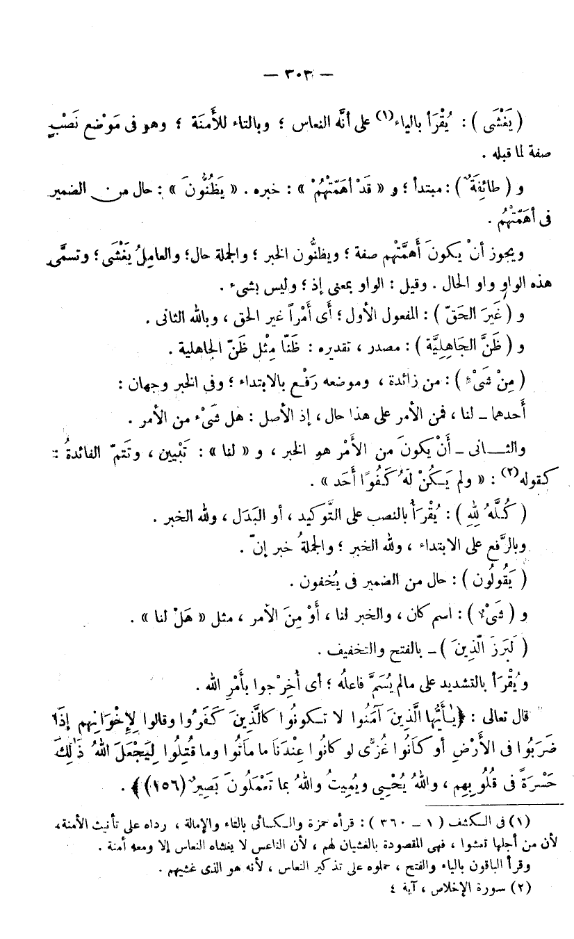 يَغْشَى) : يُقْرَأُ بِالْيَاءِ عَلَى أَنَّهُ النُّعَاسُ، وَبِالتَّاءِ لِلْأَمَنَةِ، وَهُوَ فِي مَوْضِعِ نَصْبٍ صِفَةٌ لِمَا قَبْلَهُ. وَ (طَائِفَةً) : مُبْتَدَأٌ، وَ (قَدْ أَهَمَّتْهُمْ) : خَبَرُهُ: «يَظُنُّونَ» حَالٌ مِنَ الضَّمِيرِ فِي أَهَمَّتْهُمْ، وَيَجُوزُ أَنْ يَكُونَ أَهَمَّتْهُمْ صِفَةً، وَيَظُنُّونَ الْخَبَرَ، وَالْجُمْلَةُ حَالٌ، وَالْعَامِلُ يَغْشَى، وَتُسَمَّى هَذِهِ الْوَاوُ وَاوَ الْحَالِ. وَقِيلَ: الْوَاوُ بِمَعْنَى إِذْ وَلَيْسَ بِشَيْءٍ.