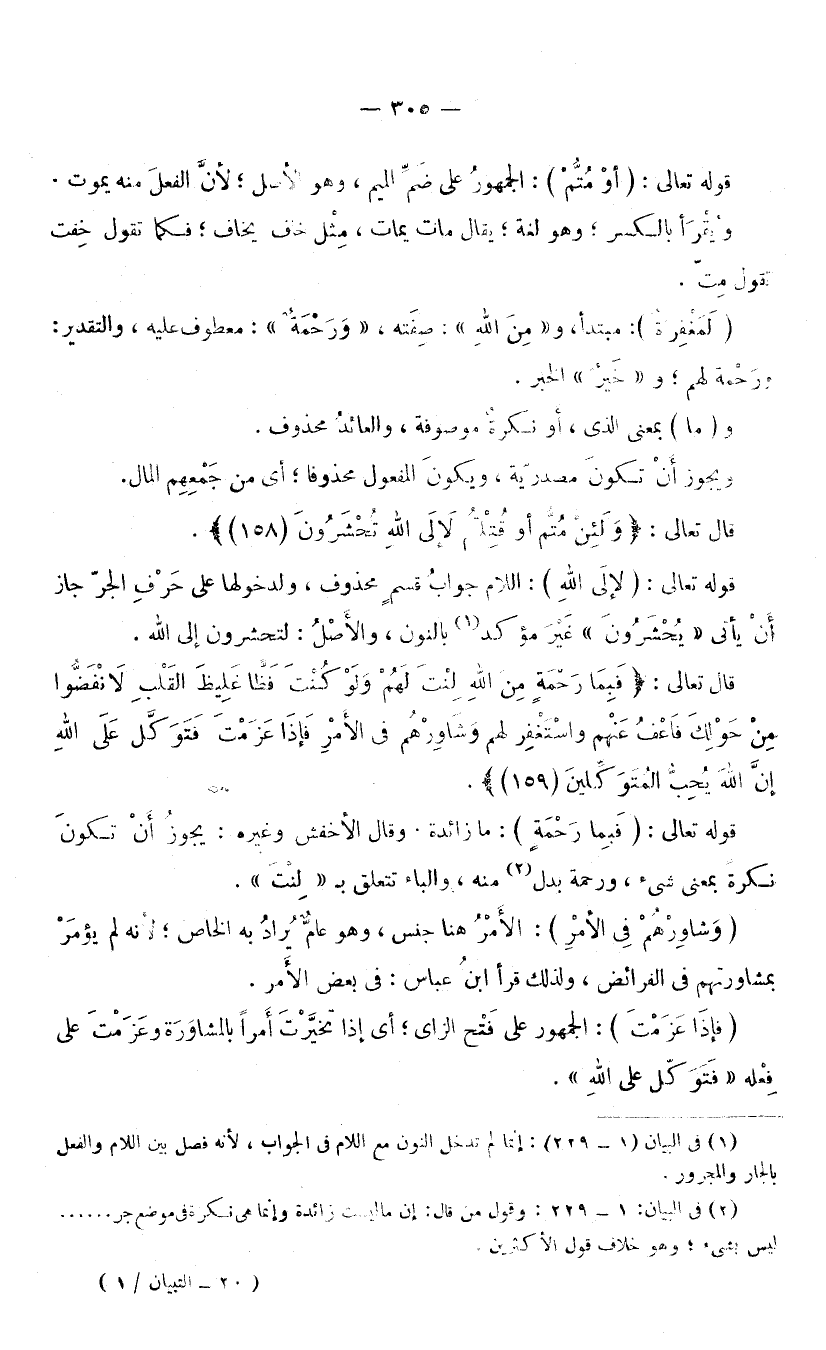 قَوْلُهُ تَعَالَى: (فَبِمَا رَحْمَةٍ) : مَا زَائِدَةٌ، وَقَالَ الْأَخْفَشُ وَغَيْرُهُ: يَجُوزُ أَنْ تَكُونَ نَكِرَةً بِمَعْنَى شَيْءٍ، وَ (رَحْمَةٍ) بَدَلٌ مِنْهُ، وَالْبَاءُ تَتَعَلَّقُ بِـ «لِنْتَ» (وَشَاوِرْهُمْ فِي الْأَمْرِ) : الْأَمْرُ هُنَا جِنْسٌ وَهُوَ عَامٌّ يُرَادُ بِهِ الْخَاصُّ ; لِأَنَّهُ لَمْ يُؤْمَرْ بِمُشَاوَرَتِهِمْ فِي الْفَرَائِضِ، وَلِذَلِكَ قَرَأَ ابْنُ عَبَّاسٍ: فِي بَعْضِ الْأَمْرِ. (فَإِذَا عَزَمْتَ) : الْجُمْهُورُ عَلَى فَتْحِ الزَّايِ ; أَيْ إِذَا تَخَيَّرْتَ أَمْرًا بِالْمُشَاوَرَةِ وَعَزَمْتَ عَلَى فِعْلِهِ «فَتَوَكَّلْ عَلَى اللَّهِ»