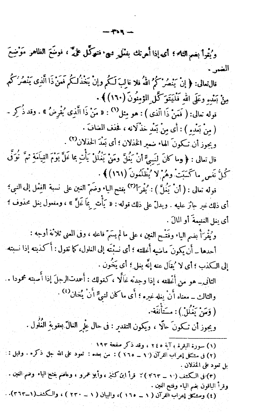 قَوْلُهُ تَعَالَى: (أَنْ يَغُلَّ) : يُقْرَأُ بِفَتْحِ الْيَاءِ وَضَمِّ الْغَيْنِ عَلَى نِسْبَةِ الْفِعْلِ إِلَى النَّبِيِّ ; أَيْ ذَلِكَ غَيْرُ جَائِزٍ عَلَيْهِ، وَيَدُلُّ عَلَى ذَلِكَ قَوْلُهُ: (يَأْتِ بِمَا غَلَّ) وَمَفْعُولُ يَغُلُّ مَحْذُوفٌ ; أَيْ يَغُلُّ الْغَنِيمَةَ أَوِ الْمَالَ.