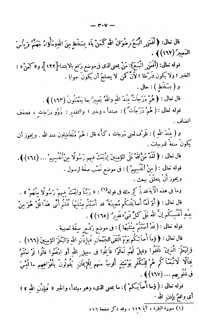قَوْلُهُ تَعَالَى: (أَفَمَنِ اتَّبَعَ) : مَنْ بِمَعْنَى الَّذِي فِي مَوْضِعِ رَفْعٍ بِالِابْتِدَاءِ، وَ «كَمَنْ» الْخَبَرُ، وَلَا يَكُونُ شَرْطًا ; لِأَنَّ كَمَنْ لَا يَصْلُحُ أَنْ يَكُونَ جَوَابًا وَ (بِسَخَطٍ) : حَالٌ.
