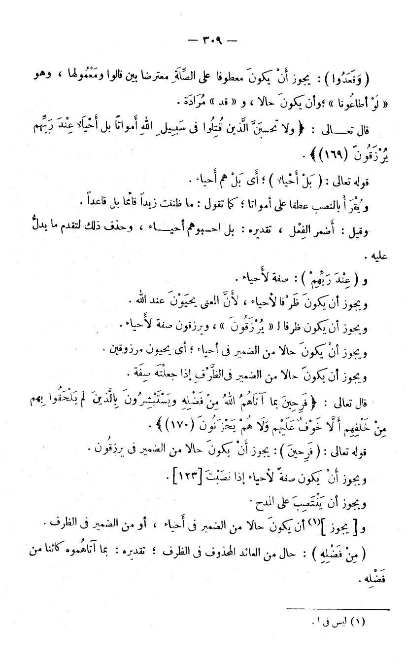 قَوْلُهُ تَعَالَى: (بَلْ أَحْيَاءٌ) : أَيْ بَلْ هُمْ أَحْيَاءٌ. وَيُقْرَأُ بِالنَّصْبِ عَطْفًا عَلَى (أَمْوَاتًا) ، كَمَا تَقُولُ: ظَنَنْتُ زَيْدًا قَائِمًا ; بَلْ قَاعِدًا. وَقِيلَ: أَضْمَرَ الْفِعْلَ، تَقْدِيرُهُ: بَلِ احْسِبُوهُمْ أَحْيَاءً، وَحَذَفَ ذَلِكَ لِتَقَدُّمِ مَا يَدُلُّ عَلَيْهِ. وَ (عِنْدَ رَبِّهِمْ) : صِفَةٌ لِأَحْيَاءٍ، وَيَجُوزُ أَنْ يَكُونَ ظَرْفًا لِأَحْيَاءٍ ; لِأَنَّ الْمَعْنَى يَحْيَوْنَ عِنْدَ اللَّهِ. وَيَجُوزُ أَنْ يَكُونَ ظَرْفًا لِـ «يُرْزَقُونَ» ، وَيُرْزَقُونَ صِفَةٌ لِأَحْيَاءٍ. وَيَجُوزُ أَنْ يَكُونَ حَالًا مِنَ الضَّمِيرِ فِي أَحْيَاءٍ ; أَيْ يَحْيَوْنَ مَرْزُوقِينَ. وَيَجُوزُ أَنْ يَكُونَ حَالًا مِنَ الضَّمِيرِ فِي الظَّرْفِ إِذَا جَعَلْتَهُ صِفَةً.