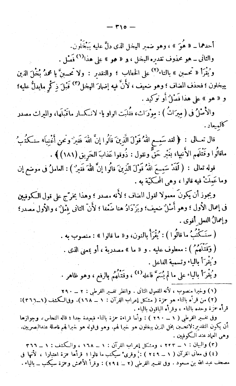 وَيُقْرَأُ: «تَحْسَبَنَّ» بِالتَّاءِ عَلَى الْخِطَابِ، وَالتَّقْدِيرُ: وَلَا تَحْسَبَنَّ يَا مُحَمَّدُ بُخْلَ الَّذِينَ يَبْخَلُونَ فَحَذَفَ الْمُضَافَ، وَهُوَ ضَعِيفٌ ; لِأَنَّ فِيهِ إِضْمَارُ الْبُخْلِ، قَبْلَ ذِكْرِ مَا يَدُلُّ عَلَيْهِ، وَهُوَ عَلَى هَذَا فَصْلٌ، أَوْ تَوْكِيدٌ، وَالْأَصْلُ فِي (مِيرَاثُ) : مِوْرَاثٌ، فَقُلِبَتِ الْوَاوُ يَاءً لِانْكِسَارِ مَا قَبْلَهَا، وَالْمِيرَاثُ مَصْدَرٌ كَالْمِيعَادِ.