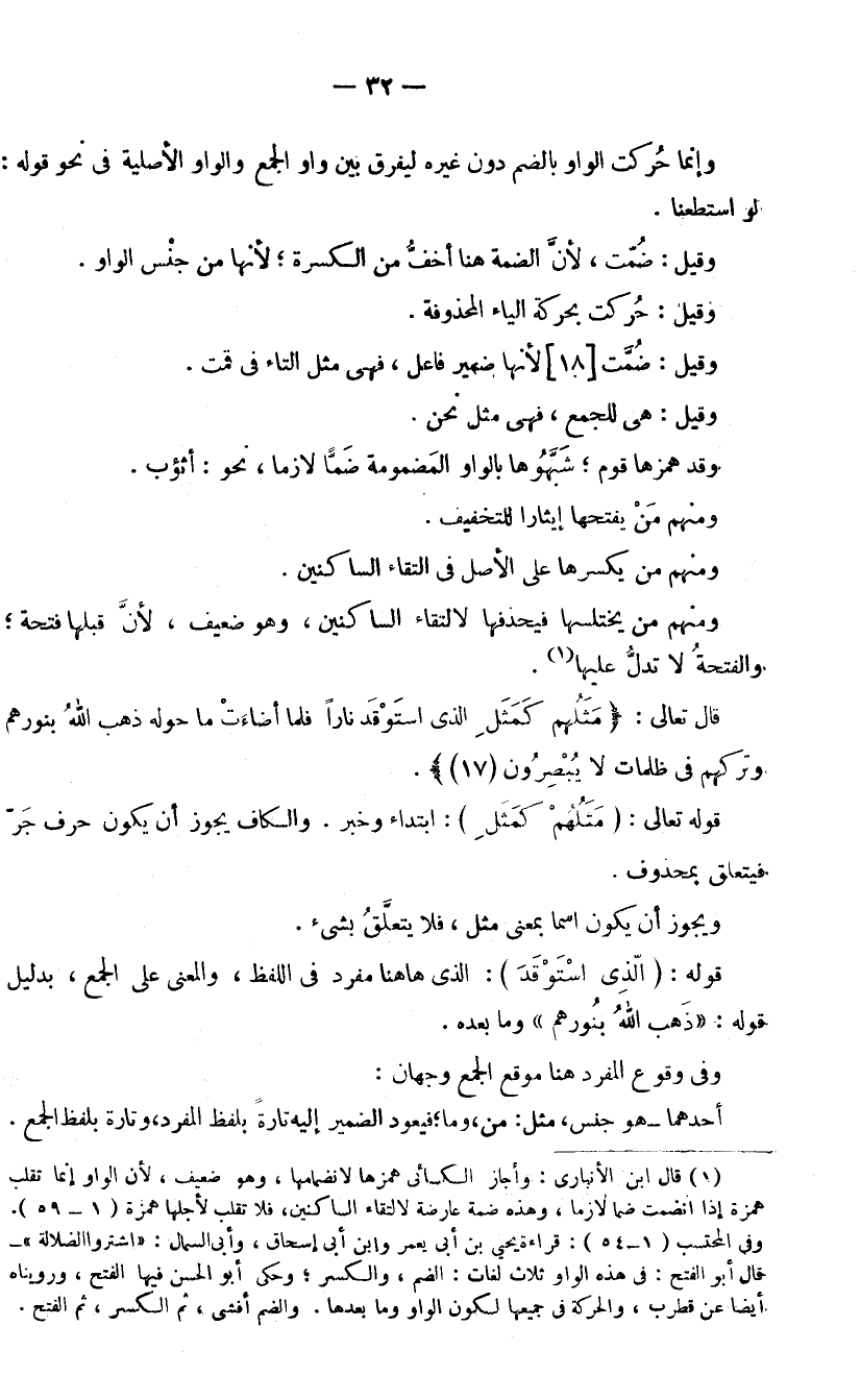 قَوْلُهُ: (الَّذِي اسْتَوْقَدَ) : الَّذِي هَاهُنَا مُفْرَدٌ فِي اللَّفْظِ، وَالْمَعْنَى عَلَى الْجَمْعِ، بِدَلِيلِ قَوْلِهِ: ((ذَهَبَ اللَّهُ بِنُورِهِمْ)) وَمَا بَعْدَهُ. وَفِي وُقُوعِ الْمُفْرَدِ هُنَا مَوْقِعَ الْجَمْعِ وَجْهَانِ: أَحَدُهُمَا: هُوَ جِنْسٌ، مِثْلُ: مَنْ وَمَا، فَيَعُودُ الضَّمِيرُ إِلَيْهِ تَارَةً بِلَفْظِ الْمُفْرَدِ، وَتَارَةً بِلَفْظِ الْجَمْعِ.