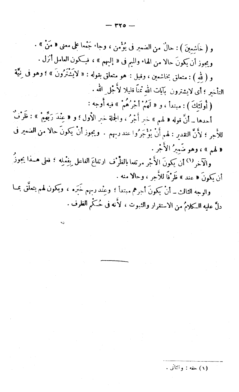 وَ (خَاشِعِينَ) : حَالٌ مِنَ الضَّمِيرِ فِي يُؤْمِنُ، وَجَاءَ جَمْعًا عَلَى مَعْنَى «مَنْ» . وَيَجُوزُ أَنْ يَكُونَ حَالًا مِنَ الْهَاءِ وَالْمِيمِ فِي إِلَيْهِمْ فَيَكُونُ الْعَامِلُ أُنْزِلَ. وَ (لِلَّهِ) : مُتَعَلِّقٌ بِخَاشِعِينَ، وَقِيلَ: هُوَ مُتَعَلِّقٌ بِقَوْلِهِ: «لَا يَشْتَرُونَ» وَهُوَ فِي نِيَّةِ التَّأْخِيرِ؛ أَيْ: لَا يَشْتَرُونَ بِآيَاتِ اللَّهِ ثَمَنًا قَلِيلًا لِأَجْلِ اللَّهِ. (أُولَئِكَ) : مُبْتَدَأٌ، وَ «لَهُمْ أَجْرُهُمْ» فِيهِ أَوْجُهٌ: أَحَدُهَا: أَنَّ قَوْلَهُ لَهُمْ خَبَرُ أَجْرٍ، وَالْجُمْلَةُ خَبَرُ الْأَوَّلِ؛ وَ «عِنْدَ رَبِّهِمْ» ظَرْفٌ لِلْأَجْرِ؛ لِأَنَّ التَّقْدِيرَ: لَهُمْ أَنْ يُؤْجَرُوا عِنْدَ رَبِّهِمْ، وَيَجُوزُ أَنْ يَكُونَ حَالًا مِنَ الضَّمِيرِ فِي لَهُمْ وَهُوَ ضَمِيرُ الْأَجْرِ، وَالْآخَرُ: أَنْ يَكُونَ الْأَجْرُ مُرْتَفِعًا بِالظَّرْفِ ارْتِفَاعَ الْفَاعِلِ بِفِعْلِهِ، فَعَلَى هَذَا يَجُوزُ أَنْ يَكُونَ عِنْدَ ظَرْفًا لِلْأَجْرِ، وَحَالًا مِنْهُ. وَالْوَجْهُ الثَّالِثُ: أَنْ يَكُونَ أَجْرُهُمْ مُبْتَدَأً، وَعِنْدَ رَبِّهِمْ خَبَرَهُ، وَيَكُونَ لَهُمْ يَتَعَلَّقُ بِمَا دَلَّ عَلَيْهِ الْكَلَامُ مِنَ الِاسْتِقْرَارِ وَالثُّبُوتِ؛ لِأَنَّهُ فِي حُكْمِ الظَّرْفِ.