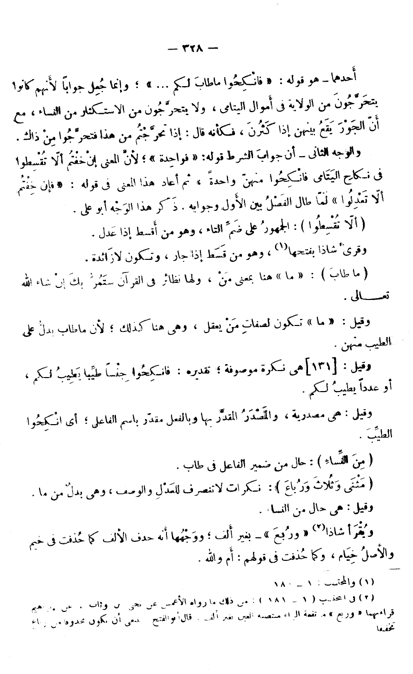 وَقِيلَ: هِيَ نَكِرَةٌ مَوْصُوفَةٌ؛ تَقْدِيرُهُ: فَانْكِحُوا جِنْسًا طَيِّبًا يَطِيبُ لَكُمْ، أَوْ عَدَدًا يَطِيبُ لَكُمْ، وَقِيلَ: هِيَ مَصْدَرِيَّةٌ، وَالْمَصْدَرُ الْمُقَدَّرُ بِهَا وَبِالْفِعْلِ مُقَدَّرٌ بِاسْمِ الْفَاعِلِ؛ أَيِ: انْكِحُوا الطَّيِّبَ. (مِنَ النِّسَاءِ) : حَالٌ مِنْ ضَمِيرِ الْفَاعِلِ فِي طَابَ. (مَثْنَى وَثُلَاثَ وَرُبَاعَ) : نَكِرَاتٌ لَا تَنْصَرِفُ لِلْعَدْلِ وَالْوَصْفِ وَهِيَ بَدَلٌ مِنْ مَا. وَقِيلَ: هِيَ حَالٌ مِنَ النِّسَاءِ. وَيُقْرَأُ شَاذًّا.