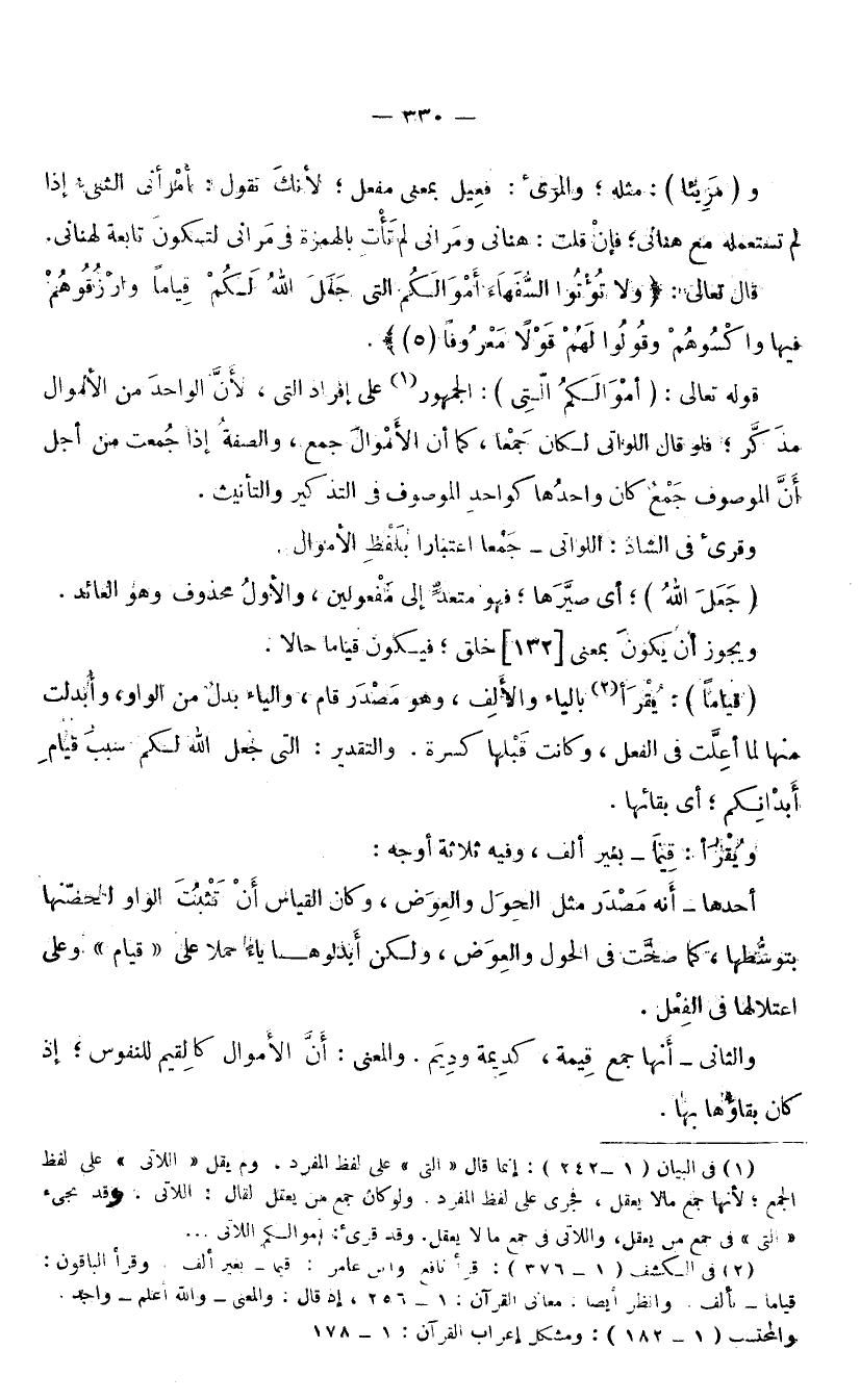 مُذَكَّرٌ؛ فَلَوْ قَالَ اللَّوَاتِي لَكَانَ جَمْعًا، كَمَا أَنَّ الْأَمْوَالَ جَمْعٌ، وَالصِّفَةُ إِذَا جُمِعَتْ مِنْ أَجْلِ أَنَّ الْمَوْصُوفَ جَمْعٌ كَانَ وَاحِدُهَا كَوَاحِدِ الْمَوْصُوفِ فِي التَّذْكِيرِ وَالتَّأْنِيثِ. وَقُرِئَ فِي الشَّاذِّ اللَّوَاتِي جَمْعًا اعْتِبَارًا بِلَفْظِ الْأَمْوَالِ. (جَعَلَ اللَّهُ) : أَيْ: صَيَّرَهَا، فَهُوَ مُتَعَدٍّ إِلَى مَفْعُولَيْنِ، وَالْأَوَّلُ مَحْذُوفٌ، وَهُوَ الْعَائِدُ، وَيَجُوزُ أَنْ يَكُونَ بِمَعْنَى خَلَقَ، فَيَكُونُ قِيَامًا حَالًا. (قِيَامًا) : يُقْرَأُ بِالْيَاءِ وَالْأَلِفِ، وَهُوَ مَصْدَرُ قَامَ، وَالْيَاءُ بَدَلٌ مِنَ الْوَاوِ، وَأُبْدِلَتْ مِنْهَا لَمَّا أُعِلَّتْ فِي الْفِعْلِ، وَكَانَتْ قَبْلَهَا كَسْرَةٌ، وَالتَّقْدِيرُ: الَّتِي جَعَلَ اللَّهُ لَكُمْ سَبَبَ قِيَامِ أَبْدَانِكُمْ؛ أَيْ: بَقَائِهَا.