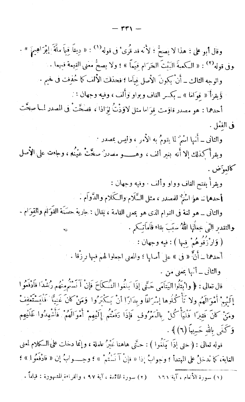 وَقَالَ أَبُو عَلَيٍّ: هَذَا لَا يَصِحُّ لِأَنَّهُ قَدْ قُرِئَ فِي قَوْلِهِ: (دِينًا قِيَمًا مِلَّةَ إِبْرَاهِيمَ) [الْأَنْعَامِ: 161] ، وَفِي قَوْلِهِ: (الْكَعْبَةَ الْبَيْتَ الْحَرَامَ قِيَامًا) [الْمَائِدَةِ: 97] ، وَلَا يَصِحُّ مَعْنَى الْقِيمَةِ فِيهِمَا. وَالْوَجْهُ الثَّالِثُ: أَنْ يَكُونَ الْأَصْلُ قِيَامًا فَحُذِفَتِ الْأَلِفُ كَمَا حُذِفَتْ فِي خِيَمٍ، وَيُقْرَأُ: قِوَامًا بِكَسْرِ الْقَافِ، وَبِوَاوٍ وَأَلِفٍ، وَفِيهِ وَجْهَانِ: أَحَدُهُمَا: هُوَ مَصْدَرُ قَاوَمْتُ قِوَامًا مِثْلُ لَاوَذْتُ لِوَاذًا، فَصَحَّتْ فِي الْمَصْدَرِ لَمَّا صَحَّتْ فِي الْفِعْلِ. وَالثَّانِي: أَنَّهَا اسْمٌ لِمَا يَقُومُ بِهِ الْأَمْرُ وَلَيْسَ بِمَصْدَرٍ. وَيُقْرَأُ كَذَلِكَ إِلَّا أَنَّهُ بِغَيْرِ أَلِفٍ وَهُوَ مَصْدَرٌ صَحَّتْ عَيْنُهُ، وَجَاءَتْ عَلَى الْأَصْلِ كَالْعِوَضِ. وَيُقْرَأُ بِفَتْحِ الْقَافِ وَوَاوٍ وَأَلِفٍ وَفِيهِ وَجْهَانِ: أَحَدُهُمَا: هُوَ اسْمٌ لِلْمَصْدَرِ مِثْلُ السَّلَامِ وَالْكَلَامِ وَالدَّوَامِ. وَالثَّانِي: هُوَ لُغَةٌ فِي الْقِوَامِ الَّذِي هُوَ بِمَعْنَى الْقَامَةِ؛ يُقَالُ جَارِيَةٌ حَسَنَةُ الْقَوَامِ وَالْقِوَامِ وَالتَّقْدِيرُ: الَّتِي جَعَلَهَا اللَّهُ سَبَبَ بَقَاءِ قَامَاتِكُمْ.