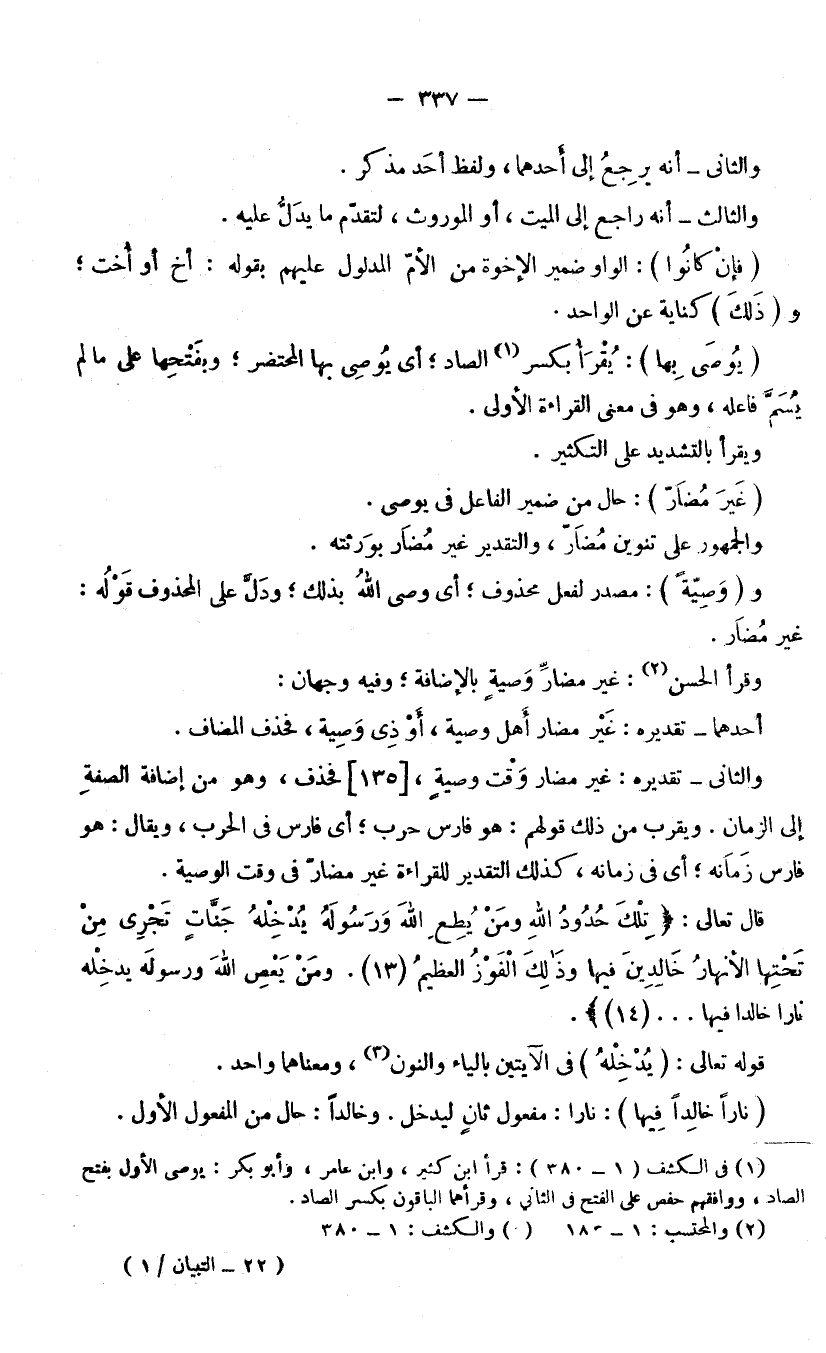 وَالثَّانِي: أَنَّهُ يَرْجِعُ إِلَى أَحَدِهِمَا، وَلَفْظُ أَحَدٍ مُذَكَّرٌ. وَالثَّالِثُ: أَنَّهُ رَاجِعٌ إِلَى الْمَيِّتِ أَوِ الْمَوْرُوثِ، لِتَقَدُّمِ مَا يَدُلُّ عَلَيْهِ. (فَإِنْ كَانُوا) : الْوَاوُ ضَمِيرُ الْإِخْوَةِ مِنَ الْأُمِّ الْمَدْلُولِ عَلَيْهِمْ بِقَوْلِهِ أَخٌ أَوْ أُخْتٌ وَ (ذَلِكَ) : كِنَايَةٌ عَنِ الْوَاحِدِ. (يُوصَى بِهَا) : يُقْرَأُ بِكَسْرِ الصَّادِ؛ أَيْ: يُوصِي بِهَا الْمُحْتَضِرُ وَبِفَتْحِهَا عَلَى مَا لَمْ يُسَمَّ فَاعِلُهُ، وَهُوَ فِي مَعْنَى الْقِرَاءَةِ الْأُولَى، وَيُقْرَأُ بِالتَّشْدِيدِ عَلَى التَّكْثِيرِ. (غَيْرَ مُضَارٍّ) : حَالٌ مِنْ ضَمِيرِ الْفَاعِلِ فِي يُوصِي.