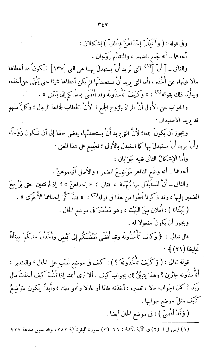 وَفِي قَوْلِهِ: (وَآتَيْتُمْ إِحْدَاهُنَّ قِنْطَارًا) : إِشْكَالَانِ: أَحَدُهُمَا: أَنَّهُ جَمَعَ الضَّمِيرَ، وَالْمُتَقَدِّمُ زَوْجَانِ. وَالثَّانِي: أَنَّ الَّتِي يُرِيدُ أَنْ يَسْتَبْدِلَ بِهَا هِيَ الَّتِي تَكُونُ قَدْ أَعْطَاهَا مَالًا، فَيَنْهَاهُ عَنْ أَخْذِهِ، فَأَمَّا الَّتِي يُرِيدُ أَنْ يَسْتَحْدِثَهَا فَلَمْ يَكُنْ أَعْطَاهَا شَيْئًا حَتَّى يُنْهَى عَنْ أَخْذِهِ، وَيَتَأَيَّدُ ذَلِكَ بِقَوْلِهِ: «وَكَيْفَ تَأْخُذُونَهُ وَقَدْ أَفْضَى بَعْضُكُمْ إِلَى بَعْضٍ» وَالْجَوَابُ عَنِ الْأَوَّلِ أَنَّ الْمُرَادَ بِالزَّوْجِ الْجَمْعُ؛ لِأَنَّ الْخِطَابَ لِجَمَاعَةِ الرِّجَالِ، وَكُلٌّ مِنْهُمْ قَدْ يُرِيدُ الِاسْتِبْدَالَ. وَيَجُوزُ أَنْ يَكُونَ جَمْعًا؛ لِأَنَّ الَّتِي يُرِيدُ أَنْ يَسْتَحْدِثَهَا يُفْضِي حَالُهَا إِلَى أَنْ تَكُونَ زَوْجًا، وَأَنْ يُرِيدَ أَنْ يَسْتَبْدِلَ بِهَا كَمَا اسْتَبْدَلَ بِالْأُولَى، فَجُمِعَ عَلَى هَذَا الْمَعْنَى.