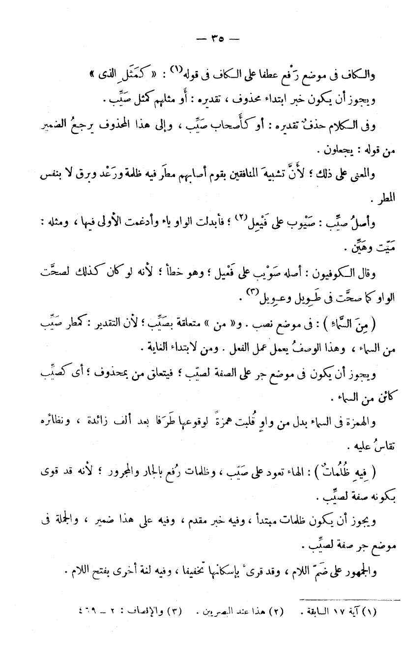 وَفِي الْكَلَامِ حَذْفٌ تَقْدِيرِهِ: أَوْ كَأَصْحَابِ صَيِّبٍ وَإِلَى هَذَا الْمَحْذُوفِ يَرْجِعُ الضَّمِيرُ مِنْ قَوْلِهِ: يَجْعَلُونَ. وَالْمَعْنَى عَلَى ذَلِكَ ; لِأَنَّ تَشْبِيهَ الْمُنَافِقِينَ بِقَوْمٍ أَصَابَهُمْ مَطَرٌ فِيهِ ظُلْمَةٌ وَرَعْدٌ وَبَرْقٌ لَا بِنَفْسِ الْمَطَرِ، وَأَصْلُ ((صَيِّبٍ)) صَيْوِبٌ عَلَى فَيْعِلٍ ; فَأُبْدِلَتِ الْوَاوُ يَاءً، وَأُدْغِمَتِ الْأُولَى فِيهَا، وَمِثْلُهُ: مَيِّتٌ وَهَيِّنٌ، وَقَالَ الْكُوفِيُّونَ: أَصْلُهُ صَوِيبٌ عَلَى فَعِيلٍ وَهُوَ خَطَأٌ ; لِأَنَّهُ لَوْ كَانَ كَذَلِكَ لَصَحَّتِ الْوَاوُ كَمَا صِحَّتْ فِي طَوِيلٍ وَعَوِيلٍ.