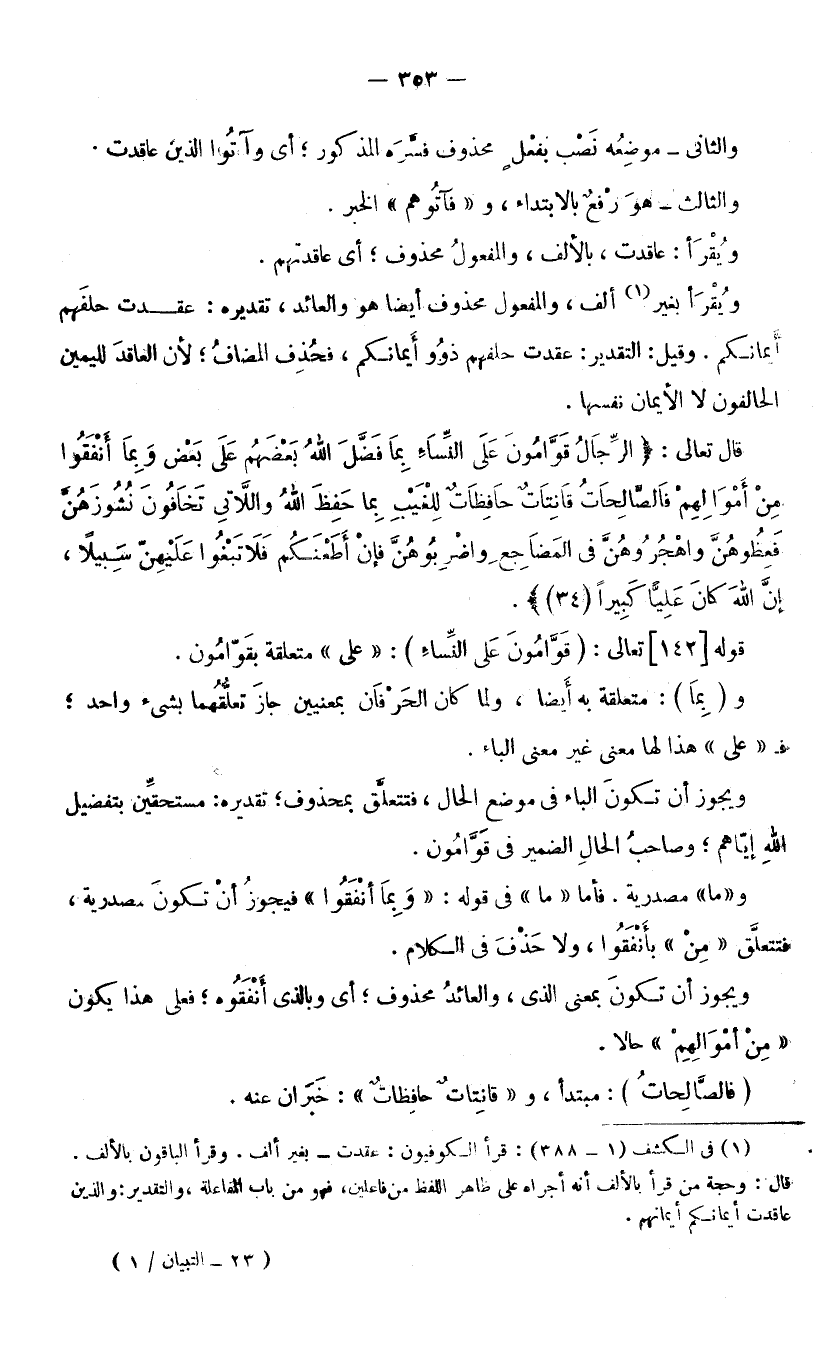 قَوْلُهُ تَعَالَى: (قَوَّامُونَ عَلَى النِّسَاءِ) : " عَلَى " مُتَعَلِّقَةٌ بِقَوَّامُونَ. وَ (بِمَا) : مُتَعَلِّقَةٌ بِهِ أَيْضًا، وَلَمَّا كَانَ الْحَرْفَانِ بِمَعْنَيَيْنِ، جَازَ تَعَلُّقُهُمَا بِشَيْءٍ وَاحِدٍ؛ فَـ " عَلَى " عَلَى هَذَا لَهَا مَعْنًى غَيْرُ مَعْنَى الْبَاءِ. وَيَجُوزُ أَنْ تَكُونَ الْبَاءُ فِي مَوْضِعِ الْحَالِ، فَتَتَعَلَّقُ بِمَحْذُوفٍ تَقْدِيرُهُ: مُسْتَحِقِّينَ