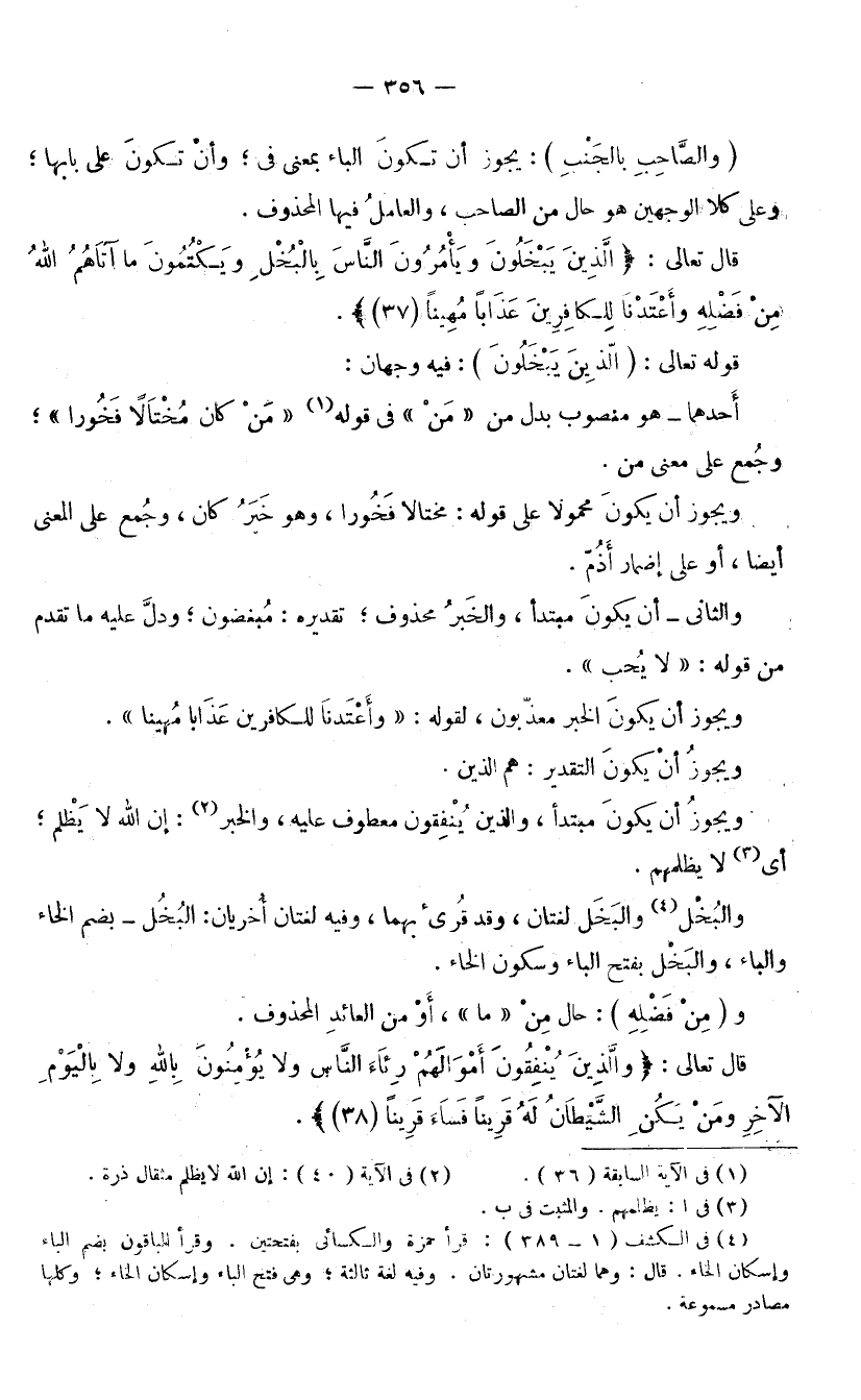قَوْلُهُ تَعَالَى: الَّذِينَ يَبْخَلُونَ فِيهِ وَجْهَانِ: أَحَدُهُمَا: هُوَ مَنْصُوبٌ بَدَلٌ مِنْ «مَنْ» فِي قَوْلِهِ: (مَنْ كَانَ مُخْتَالًا فَخُورًا) وَجُمِعَ عَلَى مَعْنَى مَنْ. وَيَجُوزُ أَنْ يَكُونَ مَحْمُولًا عَلَى قَوْلِهِ: مُخْتَالًا فَخُورًا، وَهُوَ خَبَرُ كَانَ، وَجُمِعَ عَلَى الْمَعْنَى أَيْضًا، أَوْ عَلَى إِضْمَارِ أَذُمُّ. وَالثَّانِي: أَنْ يَكُونَ مُبْتَدَأً، وَالْخَبَرُ مَحْذُوفٌ؛ تَقْدِيرُهُ: مُبْغِضُونَ؛ وَدَلَّ عَلَيْهِ مَا تَقَدَّمَ مِنْ قَوْلِهِ: لَا يُحِبُّ. وَيَجُوزُ أَنْ يَكُونَ الْخَبَرُ مُعَذَّبُونَ لِقَوْلِهِ: (وَأَعْتَدْنَا لِلْكَافِرِينَ عَذَابًا مُهِينًا) . وَيَجُوزُ أَنْ يَكُونَ التَّقْدِيرُ: هُمُ الَّذِينَ. وَيَجُوزُ أَنْ يَكُونَ مُبْتَدَأً، وَالَّذِينَ يُنْفِقُونَ مَعْطُوفٌ عَلَيْهِ، وَالْخَبَرُ «إِنَّ اللَّهَ لَا يَظْلِمُ» ؛ أَيْ: لَا يَظْلِمُهُمْ. وَالْبُخْلُ وَالْبَخْلُ لُغَتَانِ، وَقَدْ