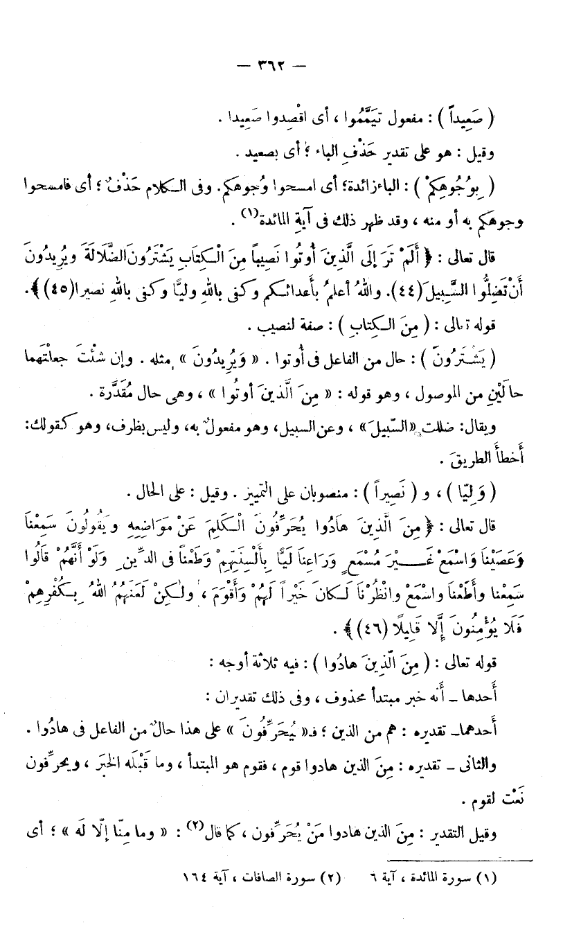 صَعِيدًا) : مَفْعُولُ تَيَمَّمُوا؛ أَيِ: اقْصُدُوا صَعِيدًا. وَقِيلَ: هُوَ عَلَى تَقْدِيرِ حَذْفِ الْبَاءِ؛ أَيْ: بِصَعِيدٍ. (بِوُجُوهِكُمْ) : الْبَاءُ زَائِدَةٌ؛ أَيِ: امْسَحُوا وُجُوهَكُمْ، وَفِي الْكَلَامِ حَذْفٌ؛ أَيْ: فَامْسَحُوا وُجُوهَكُمْ بِهِ أَوْ مِنْهُ، وَقَدْ ظَهَرَ ذَلِكَ فِي آيَةِ الْمَائِدَةِ.