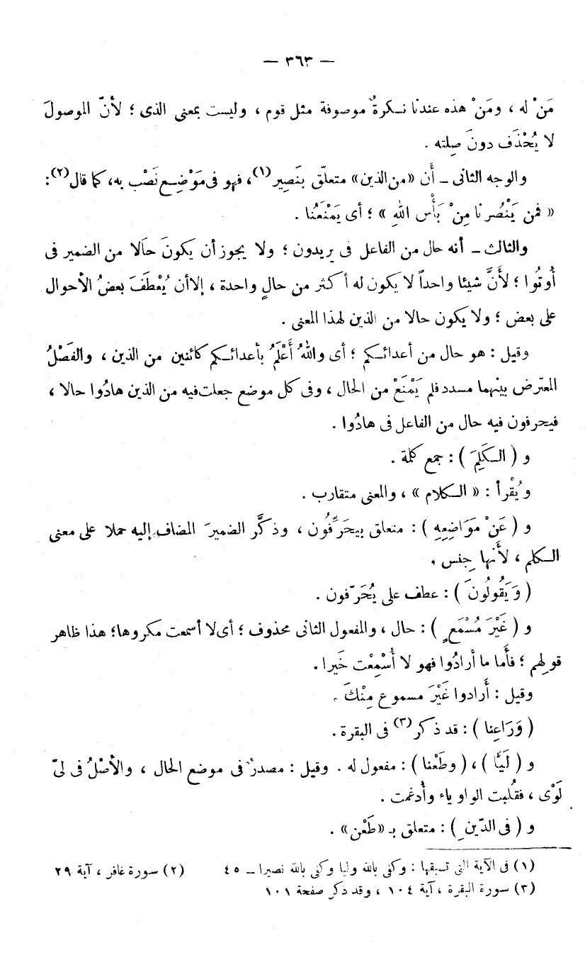 مَنْ لَهُ، وَمَنْ هَذِهِ عِنْدَنَا نَكِرَةٌ مَوْصُوفَةٌ مِثْلُ قَوْمٍ، وَلَيْسَتْ بِمَعْنَى الَّذِي؛ لِأَنَّ الْمَوْصُولَ لَا يُحْذَفُ دُونَ صِلَتِهِ. وَالْوَجْهُ الثَّانِي: أَنَّ مِنَ الَّذِينَ مُتَعَلِّقٌ بِنَصِيرٍ، فَهُوَ فِي مَوْضِعِ نَصْبٍ بِهِ، كَمَا قَالَ: (فَمَنْ يَنْصُرُنَا مِنْ بَأْسِ اللَّهِ) [غَافِرٍ: 29] ؛ أَيْ: يَمْنَعُنَا. وَالثَّالِثُ: أَنَّهُ حَالٌ مِنَ الْفَاعِلِ فِي يُرِيدُونَ، وَلَا يَجُوزُ أَنْ يَكُونَ حَالًا مِنَ الضَّمِيرِ فِي أُوتُوا؛ لِأَنَّ شَيْئًا وَاحِدًا لَا يَكُونُ لَهُ أَكْثَرُ مِنْ حَالٍ وَاحِدَةٍ، إِلَّا أَنْ يُعْطَفَ بَعْضُ الْأَحْوَالِ عَلَى بَعْضٍ، وَلَا يَكُونُ حَالًا مِنَ الَّذِينَ لِهَذَا الْمَعْنَى، وَقِيلَ: هُوَ حَالٌ مِنْ أَعْدَائِكُمْ؛ أَيْ: وَاللَّهُ أَعْلَمُ بِأَعْدَائِكُمْ كَائِنِينَ مِنَ الَّذِينَ، وَالْفَصْلُ الْمُعْتَرِضُ بَيْنَهُمَا مُسَدِّدٌ، فَلَمْ يَمْتَنِعْ مِنَ الْحَالِ، وَفِي كُلِّ مَوْضِعٍ جُعِلَتْ فِيهِ مِنَ الَّذِينَ هَادُوا حَالًا، فَيُحَرِّفُونَ فِيهِ حَالٌ مِنَ الْفَاعِلِ فِي هَادُوا. وَ (الْكَلِمَ) : جَمْعُ كَلِمَةٍ. وَيُقْرَأُ: «الْكَلَامَ» وَالْمَعْنَى مُتَقَارِبٌ. وَ (عَنْ مَوَاضِعِهِ) : مُتَعَلِّقٌ بِيُحَرِّفُونَ، وَذُكِرَ الضَّمِيرُ الْمُضَافُ إِلَيْهِ حَمْلًا عَلَى مَعْنَى الْكَلِمِ؛ لِأَنَّهَا جِنْسٌ. (وَيَقُولُونَ) : عَطْفٌ عَلَى يُحَرِّفُونَ. وَ (غَيْرَ مُسْمَعٍ) : حَالٌ، وَالْمَفْعُولُ الثَّانِي مَحْذُوفٌ؛ أَيْ: لَا أُسْمِعْتَ مَكْرُوهًا، هَذَا ظَاهِرَ قَوْلِهِمْ، فَأَمَّا مَا أَرَادُوا فَهُوَ لَا أُسْمِعْتَ خَيْرًا. وَقِيلَ: أَرَادُوا غَيْرَ مَسْمُوعٍ مِنْكَ. (وَرَاعِنَا) : قَدْ ذُكِرَ فِي الْبَقَرَةِ. وَ (لَيًّا) ، (وَطَعْنًا) : مَفْعُولٌ لَهُ. وَقِيلَ: مَصْدَرٌ فِي مَوْضِعِ الْحَالِ، وَالْأَصْلُ فِي لَيٍّ لَوَى فَقُلِبَتِ الْوَاوُ يَاءً، وَأُدْغِمَتْ. وَ (فِي الدِّينِ) : مُتَعَلِّقٌ بِـ «طَعْنٍ» . (