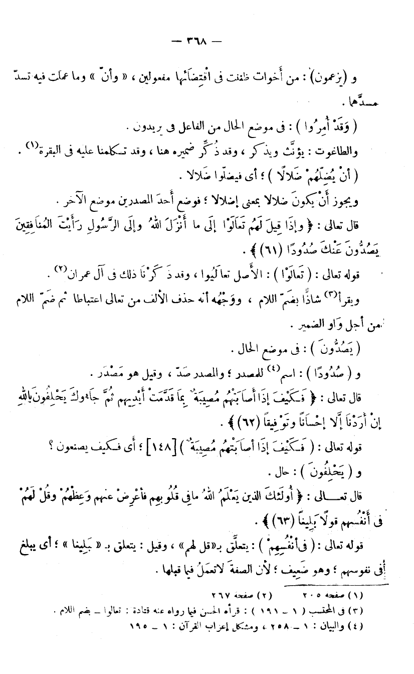 قَوْلُهُ تَعَالَى: (تَعَالَوْا) : الْأَصْلُ تَعَالَيُوا، وَقَدْ ذَكَرْنَا ذَلِكَ فِي آلِ عِمْرَانَ، وَيُقْرَأُ شَاذًّا بِضَمِّ اللَّامِ، وَوَجْهُهُ أَنَّهُ حُذِفَ الْأَلِفُ مِنْ تَعَالَى اعْتِبَاطًا، ثُمَّ ضُمَّ اللَّامُ مِنْ أَجْلِ وَاوِ الضَّمِيرِ. (يَصُدُّونَ) : فِي مَوْضِعِ الْحَالِ. وَ (صُدُودًا) : اسْمٌ لِلْمَصْدَرِ، وَالْمَصْدَرُ صَدٌّ، وَقِيلَ: هُوَ مَصْدَرٌ.