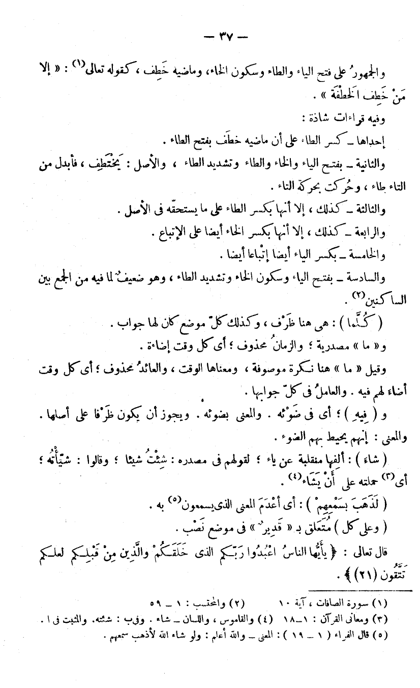 يَخْتَطِفُ، فَأُبْدِلَ مِنَ التَّاءِ طَاءٌ، وَحُرِّكَتْ بِحَرَكَةِ التَّاءِ، وَالثَّالِثَةُ: كَذَلِكَ إِلَّا أَنَّهَا بِكَسْرِ الطَّاءِ عَلَى مَا يَسْتَحِقُّهُ فِي الْأَقَلِّ. وَالرَّابِعَةُ: كَذَلِكَ، إِلَّا أَنَّهَا بِكَسْرِ الْخَاءِ أَيْضًا عَلَى الْإِتْبَاعِ.