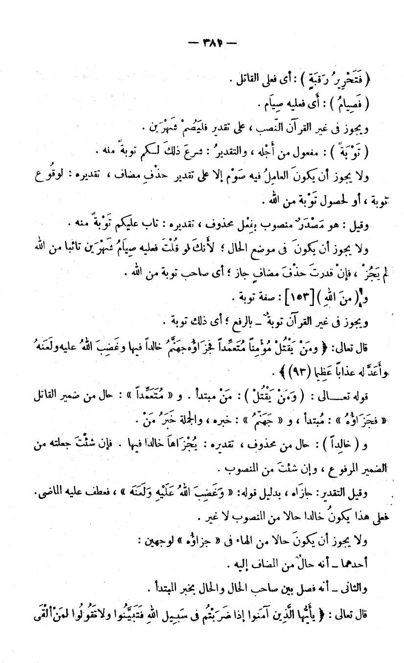 قَوْلُهُ تَعَالَى: (وَمَنْ يَقْتُلْ) : مَنْ مُبْتَدَأٌ، وَ «مُتَعَمِّدًا» حَالٌ مِنْ ضَمِيرِ الْقَاتِلِ «فَجَزَاؤُهُ» مُبْتَدَأٌ، وَ «جَهَنَّمُ» خَبَرُهُ، وَالْجُمْلَةُ خَبَرُ مَنْ، وَ (خَالِدًا) : حَالٌ مِنْ مَحْذُوفٍ تَقْدِيرُهُ: يُجَازِهَا خَالِدًا فِيهَا، فَإِنْ شِئْتَ جَعَلْتَهُ مِنَ الضَّمِيرِ الْمَرْفُوعِ، وَإِنْ شِئْتَ مِنَ الْمَنْصُوبِ. وَقِيلَ: التَّقْدِيرُ: جَازَاهُ؛ بِدَلِيلِ قَوْلِهِ: «وَغَضِبَ اللَّهُ عَلَيْهِ وَلَعَنَهُ» فَعَطَفَ عَلَيْهِ الْمَاضِيَ، فَعَلَى هَذَا يَكُونُ «خَالِدًا» حَالًا مَنَ الْمَنْصُوبِ لَا غَيْرَ، وَلَا يَجُوزُ أَنْ يَكُونَ حَالًا مِنَ الْهَاءِ فِي «جَزَاؤُهُ» لِوَجْهَيْنِ: أَحَدُهُمَا: أَنَّهُ حَالٌ مِنَ الْمُضَافِ إِلَيْهِ. وَالثَّانِي: أَنَّهُ فَصَلَ بَيْنَ صَاحِبِ الْحَالِ وَالْحَالِ بِخَبَرِ الْمُبْتَدَأِ.