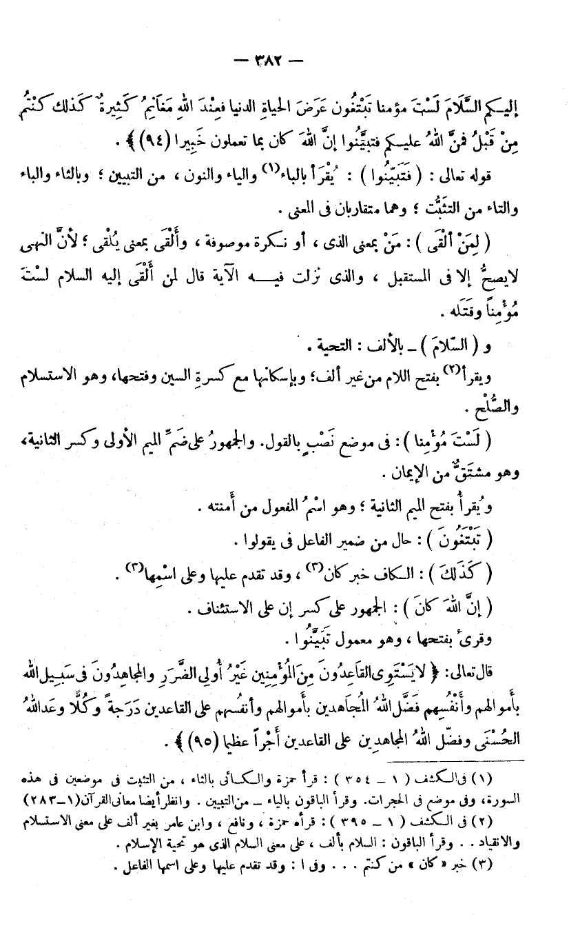 قَوْلُهُ تَعَالَى: (فَتَبَيَّنُوا) : يُقْرَأُ بِالْبَاءِ وَالْيَاءِ وَالنُّونِ مِنَ التَّبْيِينِ، وَبِالثَّاءِ وَالْبَاءِ وَالتَّاءِ مِنَ التَّثَبُّتِ، وَهُمَا مُتَقَارِبَانِ فِي الْمَعْنَى. (لِمَنْ أَلْقَى) : مَنْ بِمَعْنَى الَّذِي، أَوْ نَكِرَةٌ مَوْصُوفَةٌ، وَأَلْقَى بِمَعْنَى يُلْقِي؛ لِأَنَّ النَّهْيَ لَا يَصِحُّ إِلَّا فِي الْمُسْتَقْبَلِ، وَالَّذِي نَزَلَتْ فِيهِ الْآيَةُ قَالَ لِمَنْ أَلْقَى إِلَيْهِ السَّلَامَ لَسْتَ مُؤْمِنًا وَقَتَلَهُ. وَ (السَّلَامَ) : بِالْأَلِفِ التَّحِيَّةُ، وَيُقْرَأُ بِفَتْحِ اللَّامِ مِنْ غَيْرِ أَلِفٍ، وَبِإِسْكَانِهَا مَعَ كَسْرَةِ السِّينِ وَفَتْحِهَا، وَهُوَ الِاسْتِسْلَامُ وَالصُّلْحُ. (لَسْتَ مُؤْمِنًا) : فِي مَوْضِعِ نَصْبٍ بِالْقَوْلِ. وَالْجُمْهُورُ عَلَى ضَمِّ الْمِيمِ الْأُولَى، وَكَسْرِ الثَّانِيَةِ، وَهُوَ