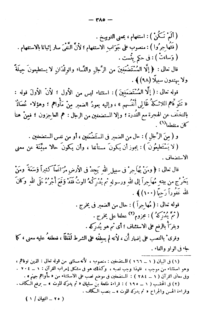 قَوْلُهُ تَعَالَى: (إِلَّا الْمُسْتَضْعَفِينَ) : اسْتِثْنَاءٌ لَيْسَ مِنَ الْأَوَّلِ؛ لِأَنَّ الْأَوَّلَ قَوْلُهُ: «تَتَوَفَّاهُمُ الْمَلَائِكَةُ ظَالِمِي أَنْفُسِهِمْ» ، وَإِلَيْهِ يَعُودُ الضَّمِيرُ مِنْ مَأْوَاهُمْ، وَهَؤُلَاءِ عُصَاةٌ بِالتَّخَلُّفِ عَنِ الْهِجْرَةِ مَعَ الْقُدْرَةِ، وَإِلَّا الْمُسْتَضْعَفِينَ مِنَ الرِّجَالِ هُمُ الْعَاجِزُونَ، فَمِنْ هُنَا كَانَ مُنْقَطِعًا. وَ (مِنَ الرِّجَالِ) : حَالٌ مِنَ الضَّمِيرِ فِي الْمُسْتَضْعَفِينَ، أَوْ مِنْ نَفْسِ الْمُسْتَضْعَفِينَ. (لَا يَسْتَطِيعُونَ) : يَجُوزُ أَنْ يَكُونَ مُسْتَأْنَفًا، وَأَنْ يَكُونَ حَالًا مُبَيِّنَةً عَنْ مَعْنَى الِاسْتِضْعَافِ.