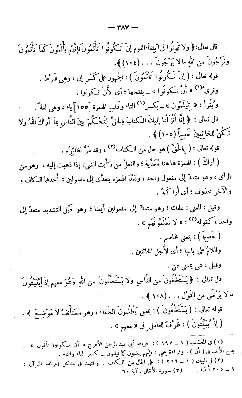 قَوْلُهُ تَعَالَى: (إِنْ تَكُونُوا تَأْلَمُونَ) : الْجُمْهُورُ عَلَى كَسْرِ إِنَّ وَهِيَ شَرْطٌ. وَقُرِئَ: «أَنْ تَكُونُوا» بِفَتْحِهَا؛ أَيْ: لِأَنْ تَكُونُوا. وَيُقْرَأُ: «تِيلَمُونَ» بِكَسْرِ التَّاءِ وَقَلْبِ الْهَمْزَةِ يَاءً، وَهِيَ لُغَةٌ.