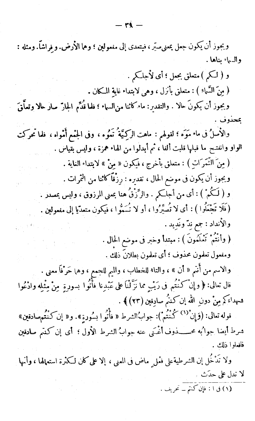 قَوْلُهُ تَعَالَى: (وَإِنْ كُنْتُمْ) : جَوَابُ الشَّرْطِ ((فَأْتُوا بِسُورَةٍ)) . وَ ((إِنْ كُنْتُمْ صَادِقِينَ)) شَرْطٌ أَيْضًا جَوَابُهُ مَحْذُوفٌ أَغْنَى عَنْهُ جَوَابُ الشَّرْطِ الْأَوَّلِ ; أَيْ إِنْ كُنْتُمْ صَادِقِينَ فَافْعَلُوا ذَلِكَ. وَلَا تَدْخُلُ إِنِ الشَّرْطِيَّةُ عَلَى فِعْلٍ مَاضٍ فِي الْمَعْنَى ; إِلَّا عَلَى كَانَ لِكَثْرَةِ اسْتِعْمَالِهَا، وَأَنَّهَا لَا تَدُلُّ عَلَى حَدَثٍ. (