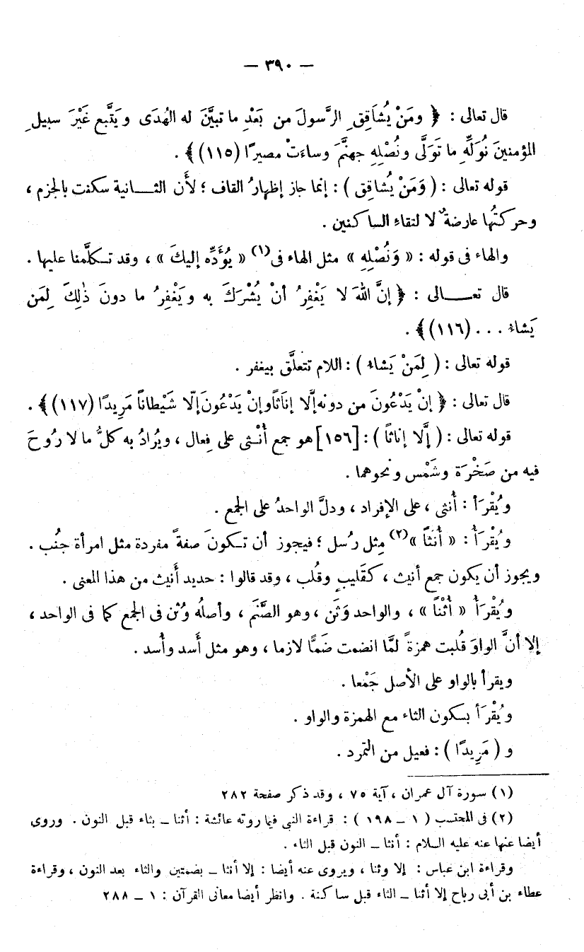 قَوْلُهُ تَعَالَى: (إِلَّا إِنَاثًا) : هُوَ جَمْعُ أُنْثَى عَلَى فِعَالٍ، وَيُرَادُ بِهِ كُلُّ مَا لَا رُوحَ فِيهِ مِنْ صَخْرَةٍ، وَشَمْسٍ، وَنَحْوِهِمَا، وَيُقْرَأُ أُنْثَى عَلَى الْإِفْرَادِ، وَدَلَّ الْوَاحِدُ عَلَى الْجَمْعِ، وَيُقْرَأُ: «أُنُثًا» مِثْلُ رُسُلٍ، فَيَجُوزُ أَنْ تَكُونَ صِفَةً مُفْرَدَةً مِثْلَ امْرَأَةٍ جُنُبٍ، وَيَجُوزُ أَنْ يَكُونَ جَمْعَ أَنِيثٍ كَقَلِيبٍ وَقُلُبٍ، وَقَدْ قَالُوا: جِدِيدُ أَنِيثٍ مِنْ هَذَا الْمَعْنَى. وَيُقْرَأُ «أُنْثًا» وَالْوَاحِدُ وَثَنٌ، وَهُوَ الصَّنَمُ وَأَصْلُهُ وُثُنٌ فِي الْجَمْعِ، كَمَا فِي الْوَاحِدِ إِلَّا أَنَّ الْوَاوَ قُلِبَتْ هَمْزَةً لَمَّا انْضَمَّتْ ضَمًّا لَازِمًا، وَهُوَ مِثْلُ أَسَدٍ وَأُسُدٍ، وَيُقْرَأُ بِالْوَاوِ عَلَى الْأَصْلِ جَمْعًا، وَيُقْرَأُ بِسُكُونِ الثَّاءِ مَعَ الْهَمْزَةِ وَالْوَاوِ. وَ (مَرِيدًا) : فَعِيلٌ مِنَ التَّمَرُّدِ.