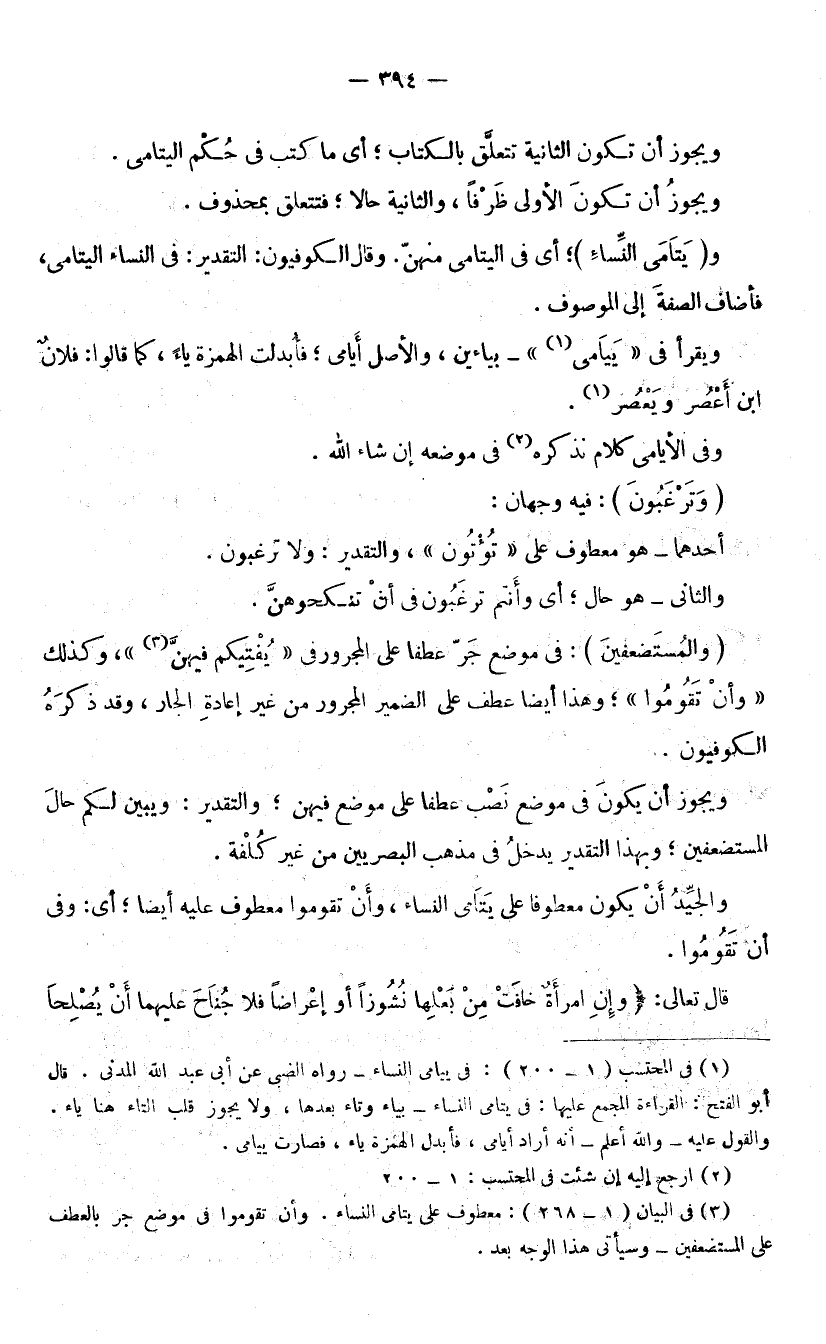 وَيَجُوزُ أَنْ تَكُونَ الثَّانِيَةُ تَتَعَلَّقُ بِالْكِتَابِ؛ أَيْ: مَا كُتِبَ فِي حُكْمِ الْيَتَامَى، وَيَجُوزُ أَنْ تَكُونَ الْأُولَى ظَرْفًا وَالثَّانِيَةُ حَالًا، فَتَتَعَلَّقُ بِمَحْذُوفٍ، وَ (يَتَامَى النِّسَاءِ) : أَيْ: فِي الْيَتَامَى مِنْهُنَّ. وَقَالَ الْكُوفِيُّونَ: التَّقْدِيرُ: فِي النِّسَاءِ الْيَتَامَى، فَأَضَافَ الصِّفَةَ إِلَى الْمَوْصُوفِ، وَيُقْرَأُ فِي يَيَامَى بِيَاءَيْنِ، وَالْأَصْلُ أَيَامَى، فَأُبْدِلَتِ الْهَمْزَةُ يَاءً كَمَا قَالُوا: فُلَانٌ ابْنُ أَعْصُرَ وَيَعْصُرَ. وُفِي الْأَيَامَى كَلَامٌ نَذْكُرُهُ فِي مَوْضِعِهِ إِنْ شَاءَ اللَّهُ.