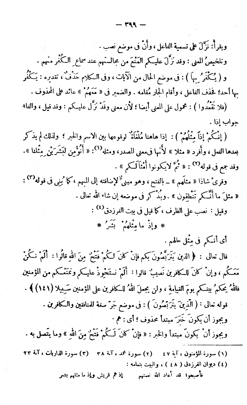 وَيُقْرَأُ «نَزَّلَ» عَلَى تَسْمِيَةِ الْفَاعِلِ، وَأَنْ فِي مَوْضِعِ نَصْبٍ. وَتَلْخِيصُ الْمَعْنَى: وَقَدْ نَزَّلَ عَلَيْكُمُ الْمَنْعَ مِنْ مُجَالَسَتِهِمْ عِنْدَ سَمَاعِ الْكُفْرِ مِنْهُمْ. وَ (يُكْفَرُ بِهَا) : فِي مَوْضِعِ الْحَالِ مِنَ الْآيَاتِ، وَفِي الْكَلَامِ حَذْفٌ تَقْدِيرُهُ: يَكْفُرُ بِهَا أَحَدٌ، فَحَذَفَ الْفَاعِلَ، وَأَقَامَ الْجَارَّ مَقَامَهُ، وَالضَّمِيرُ فِي «مَعَهُمْ» عَائِدٌ عَلَى الْمَحْذُوفِ، «فَلَا تَقْعُدُوا» مَحْمُولٌ عَلَى الْمَعْنَى أَيْضًا؛ لِأَنَّ مَعْنَى وَقَدْ نَزَّلَ عَلَيْكُمْ؛ وَقَدْ قِيلَ، وَالْفَاءُ جَوَابُ إِذَا. (إِنَّكُمْ إِذًا مِثْلُهُمْ) : إِذا هَاهُنَا مُلْغَاةٌ لِوُقُوعِهَا بَيْنَ الِاسْمِ وَالْخَبَرِ، وَلِذَلِكَ لَمْ يَذْكُرْ بَعْدَهَا الْفِعْلَ، وَأَفْرَدَ «مَثَلًا» ؛ لِأَنَّهَا فِي مَعْنَى الْمَصْدَرِ؛ وَمِثْلُهُ: (أَنُؤْمِنُ لِبَشَرَيْنِ مِثْلِنَا) [الْمُؤْمِنُونَ: 47] وَقَدْ جُمِعَ فِي قَوْلِهِ: (ثُمَّ لَا يَكُونُوا أَمْثَالَكُمْ) [مُحَمَّدٍ: 38] وَقُرِئَ شَاذًّا «مِثْلَهُمْ» بِالْفَتْحِ، وَهُوَ مَبْنِيٌّ لِإِضَافَتِهِ إِلَى الْمُبْهَمِ، كَمَا بُنِيَ فِي قَوْلِهِ: (مِثْلَ مَا أَنَّكُمْ تَنْطِقُونَ) [الذَّارِيَّاتِ: 23] ، وَيُذْكَرُ فِي مَوْضِعِهِ إِنْ شَاءَ اللَّهُ تَعَالَى.