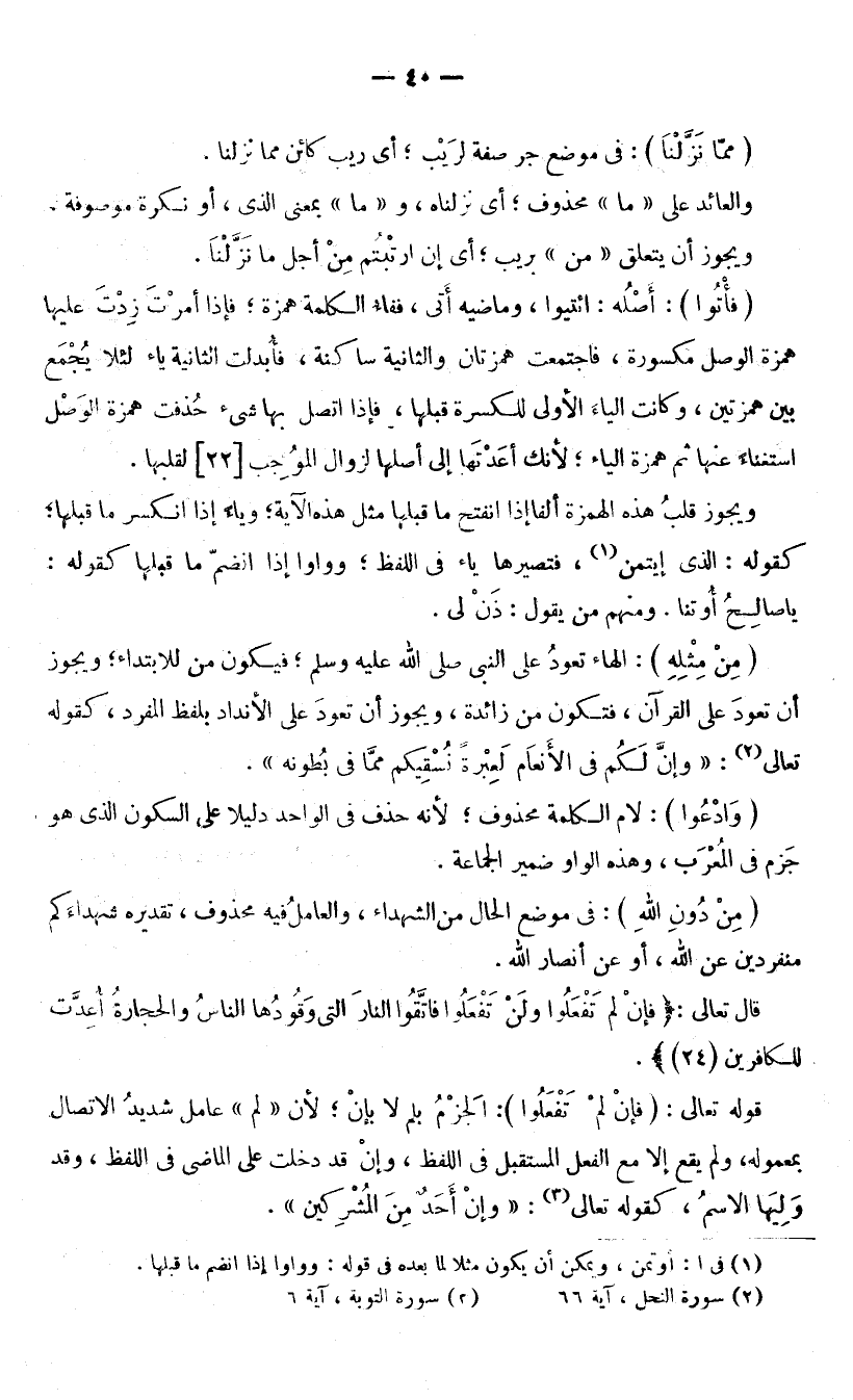 وَيَجُوزُ قَلْبُ هَذِهِ الْهَمْزَةِ أَلِفًا إِذَا انْفَتَحَ مَا قَبْلَهَا مِثْلُ هَذِهِ الْآيَةِ، وَيَاءً إِذَا انْكَسَرَ مَا قَبْلَهَا ; كَقَوْلِهِ: الَّذِي إِيتَمَنَ، فَتُصَيِّرُهَا يَاءً فِي اللَّفْظِ، وَوَاوًا إِذَا انْضَمَّ مَا قَبْلَهَا ; كَقَوْلِهِ: يَا صَالِحُ أُوتِنَا. وَمِنْهُمْ مَنْ يَقُولُ: ذَنْ لِي. (مِنْ مِثْلِهِ) : الْهَاءُ تَعُودَ عَلَى النَّبِيِّ - صَلَّى اللَّهُ عَلَيْهِ وَسَلَّمَ - فَيَكُونُ مِنْ لِلِابْتِدَاءِ، وَيَجُوزُ أَنْ تَعُودَ عَلَى الْقُرْآنِ فَتَكُونُ مِنْ زَائِدَةً، وَيَجُوزُ أَنْ تَعُودَ عَلَى الْأَنْدَادِ بِلَفْظِ الْمُفْرَدِ ; كَقَوْلِهِ تَعَالَى: (وَإِنَّ لَكُمْ فِي الْأَنْعَامِ لَعِبْرَةً نُسْقِيكُمْ مِمَّا فِي بُطُونِهِ مِنْ بَيْنِ فَرْثٍ وَدَمٍ لَبَنًا خَالِصًا سَائِغًا لِلشَّارِبِينَ) [النَّحْلِ: 66] .