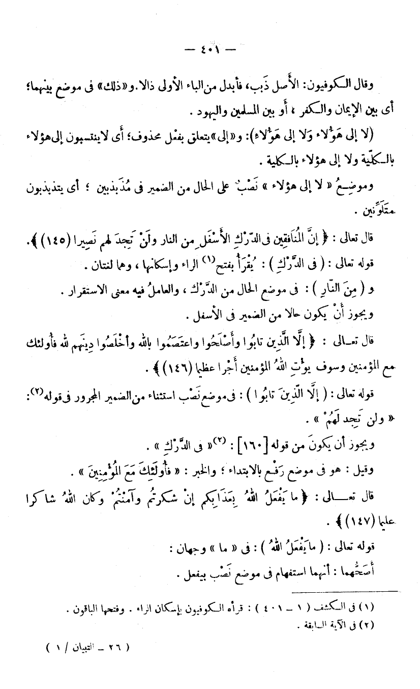 وَقَالَ الْكُوفِيُّونَ: الْأَصْلُ ذَبَبَ، فَأُبْدِلَ مِنَ الْبَاءِ الْأُولَى ذَالًا، وَ «ذَلِكَ» فِي مَوْضِعٍ بَيْنَهُمَا؛ أَيْ: بَيْنَ الْإِيمَانِ وَالْكُفْرِ، أَوْ بَيْنَ الْمُسْلِمِينَ وَالْيَهُودِ (لَا إِلَى هَؤُلَاءِ وَلَا إِلَى هَؤُلَاءِ) : وَ «إِلَى» يَتَعَلَّقُ بِفِعْلٍ مَحْذُوفٍ؛ أَيْ: لَا يَنْتَسِبُونَ إِلَى هَؤُلَاءِ بِالْكُلِّيَّةِ، وَلَا إِلَى هَؤُلَاءِ بِالْكُلِّيَّةِ، وَمَوْضِعُ (لَا إِلَى هَؤُلَاءِ) نُصِبَ عَلَى الْحَالِ مِنَ الضَّمِيرِ فِي مُذَبْذَبِينَ؛ أَيْ: يَتَذَبْذَبُونَ مُتَلَوِّنِينَ.
