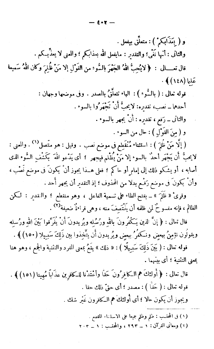 قَوْلُهُ تَعَالَى: (بِالسُّوءِ) : الْبَاءُ تَتَعَلَّقُ بِالْمَصْدَرِ، وَفِي مَوْضِعِهِمَا وَجْهَانِ: أَحَدُهُمَا: نَصْبٌ تَقْدِيرُهُ: لَا يُحِبُّ أَنْ تَجْهَرُوا بِالسُّوءِ. وَالثَّانِي: رَفْعٌ تَقْدِيرُهُ: أَنْ يُجْهَرَ بِالسُّوءِ. وَ (مِنَ الْقَوْلِ) : حَالٌ مِنَ السُّوءِ. (إِلَّا مَنْ ظُلِمَ) : اسْتِثْنَاءٌ مُنْقَطِعٌ فِي مَوْضِعِ نَصْبٍ. وَقِيلَ: هُوَ مُتَّصِلٌ، وَالْمَعْنَى لَا يُحِبُّ أَنْ يَجْهَرَ أَحَدٌ بِالسُّوءِ؛ إِلَّا مَنْ يُظْلَمُ فَيَجْهَرُ؛ أَيْ: يَدْعُو اللَّهَ بِكَشْفِ السُّوءِ الَّذِي أَصَابَهُ، أَوْ يَشْكُو ذَلِكَ إِلَى إِمَامٍ، أَوْ حَاكِمٍ؛ فَعَلَى هَذَا يَجُوزُ أَنْ يَكُونَ فِي مَوْضِعِ نَصْبٍ، وَأَنْ يَكُونَ فِي مَوْضِعِ رَفْعٍ بَدَلًا مِنَ الْمَحْذُوفِ، إِذِ التَّقْدِيرُ: أَنْ يَجْهَرَ أَحَدٌ. وَقُرِئَ: ظَلَمَ بِفَتْحِ الظَّاءِ عَلَى تَسْمِيَةِ الْفَاعِلِ، وَهُوَ مُنْقَطِعٌ، وَالتَّقْدِيرُ: لَكِنَّ الظَّالِمَ، فَإِنَّهُ مَفْسُوحٌ لِمَنْ ظَلَمُهُ أَنْ يَنْتَصِفَ مِنْهُ، وَهِيَ قِرَاءَةٌ ضَعِيفَةٌ.