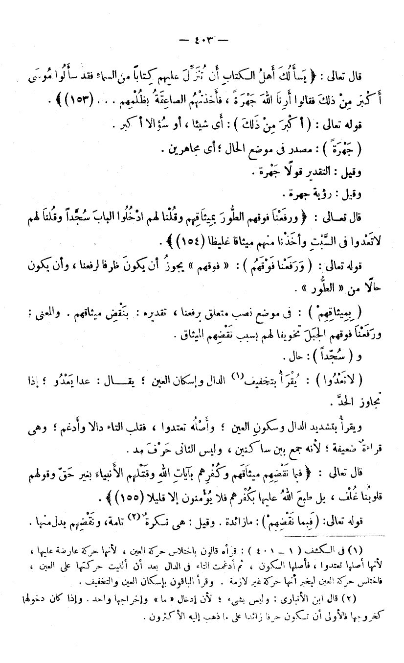 قَوْلُهُ تَعَالَى: (وَرَفَعْنَا فَوْقَهُمُ) : «فَوْقَهُمْ» يَجُوزُ أَنْ يَكُونَ ظَرْفًا لِرَفَعْنَا، وَأَنْ يَكُونَ حَالًا مِنَ «الطُّورَ» . (بِمِيثَاقِهِمْ) : فِي مَوْضِعِ نَصْبٍ مُتَعَلِّقٌ بِرَفَعْنَا تَقْدِيرُهُ: بِنَقْضِ مِيثَاقِهِمْ، وَالْمَعْنَى: وَرَفَعْنَا فَوْقَهُمُ الْجَبَلَ تَخْوِيفًا لَهُمْ؛ بِسَبَبِ نَقْضِهِمُ الْمِيثَاقَ. وَ (سُجَّدًا) : حَالٌ. (لَا تَعْدُوا) : يُقْرَأُ بِتَخْفِيفِ الدَّالِ وَإِسْكَانِ الْعَيْنِ، يُقَالُ عَدَا يَعْدُو، إِذَا تَجَاوَزَ الْحَدَّ، وَيُقْرَأُ بِتَشْدِيدِ الدَّالِ وَسُكُونِ الْعَيْنِ، وَأَصْلُهُ تَعْتَدُوا، فَقَلَبَ التَّاءَ دَالًا، وَأَدْغَمَ، وَهِيَ قِرَاءَةٌ ضَعِيفَةٌ؛ لِأَنَّهُ جَمَعَ بَيْنَ سَاكِنَيْنِ، وَلَيْسَ الثَّانِي حَرْفَ مَدٍّ.