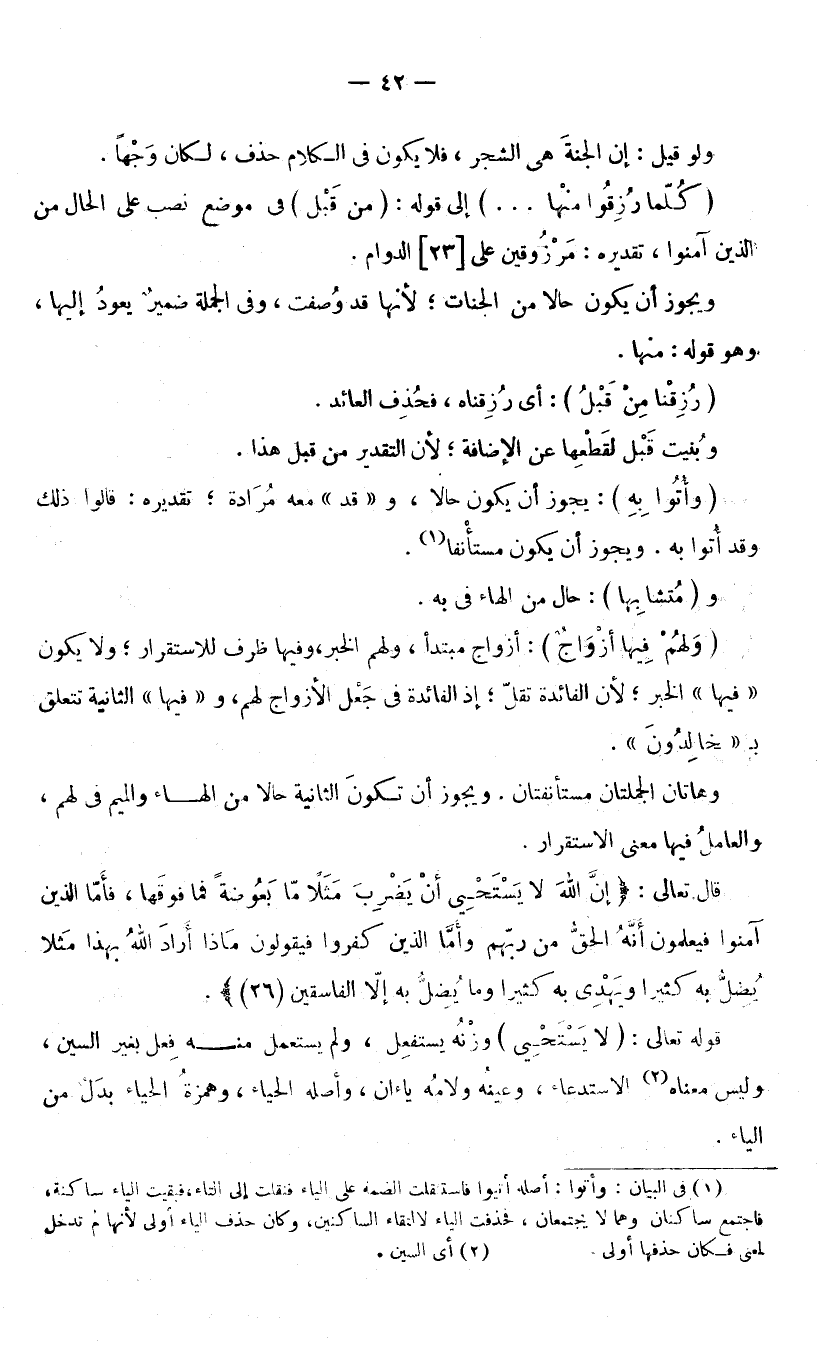 (وَأُتُوا بِهِ) : يَجُوزُ أَنْ يَكُونَ حَالًا، وَقَدْ مَعَهُ مُرَادَةٌ تَقْدِيرُهُ قَالُوا ذَلِكَ وَقَدْ أَتَوْا بِهِ. وَيَجُوزُ أَنْ يَكُونَ مُسْتَأْنَفًا. وَ (مُتَشَابِهًا) : حَالٌ مِنَ الْهَاءِ فِي بِهِ. (وَلَهُمْ فِيهَا أَزْوَاجٌ) : أَزْوَاجٌ مُبْتَدَأٌ، وَلَهُمُ الْخَبَرُ وَفِيهَا ظَرْفٌ لِلِاسْتِقْرَارِ، وَلَا يَكُونُ فِيهَا الْخَبَرُ ; لِأَنَّ الْفَائِدَةَ تَقِلُّ إِذِ الْفَائِدَةُ فِي جَعْلِ الْأَزْوَاجِ لَهُمْ، وَ (فِيهَا الثَّانِيَةُ تَتَعَلَّقُ بِـ «خَالِدُونَ» . وَهَاتَانِ الْجُمْلَتَانِ مُسْتَأْنَفَتَانِ. وَيَجُوزُ أَنْ تَكُونَ الثَّانِيَةُ حَالًا مِنَ الْهَاءِ وَالْمِيمِ فِي لَهُمْ، وَالْعَامِلُ فِيهَا مَعْنَى الِاسْتِقْرَارِ.